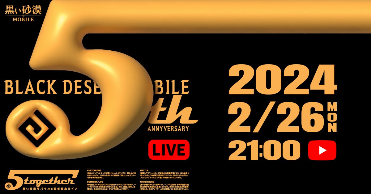 想像を超える、次世代のRPG『黒い砂漠モバイル』は2月26日(月)で5周年!本日より様々な記念イベントを開始!報酬や賞品がもらえるイベントが盛りだくさん!