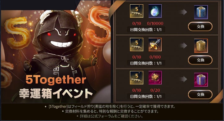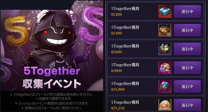 期間中、フィールド狩りを行うと、一定確率で獲得できる [5Together] を集めると、イベントページから報酬を獲得することができます。詳細は以下のURLをご確認ください。