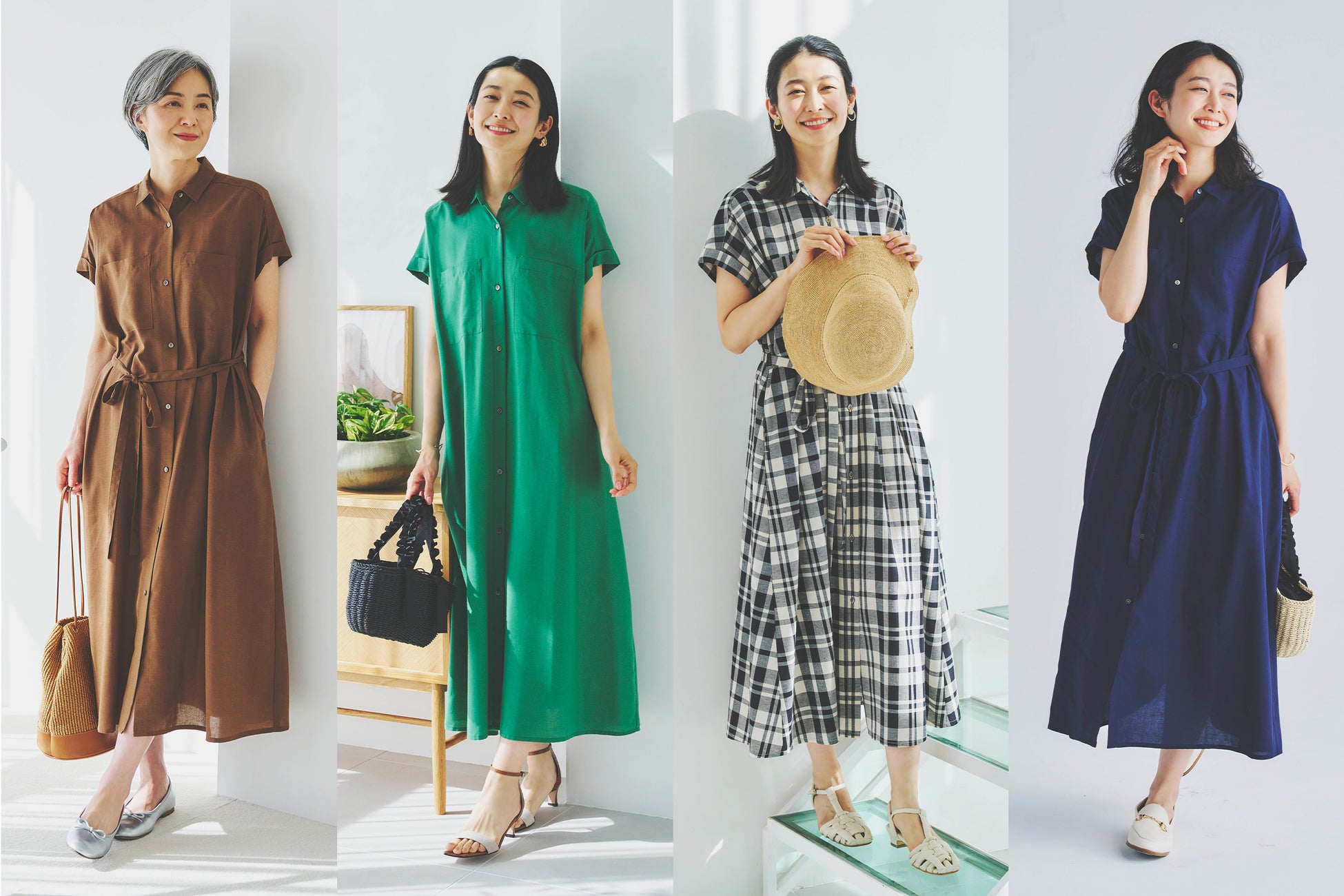 カジュアルになりがちなシャツワンピースですが、裾に向かって緩やかに広がるAラインシルエットで、1枚でも上品な雰囲気を演出してくれます。また、大きな胸ポケットは上半身の華奢見え効果もありつつ、トレンド感を落とし込んだメリハリのあるスタイルに仕上がります。ワンピースと同じ生地のベルトでウエストマークすることで、スタイルアップも。ボタンを開けて羽織としても着られてシーンや気分にあわせて様々なスタイルを楽しめる、着回し力抜群のアイテムです。カラーは夏の爽やかさがあるグリーンや1枚で存在感のあるミックス、定番のネイビーとブラウンの4色展開です。