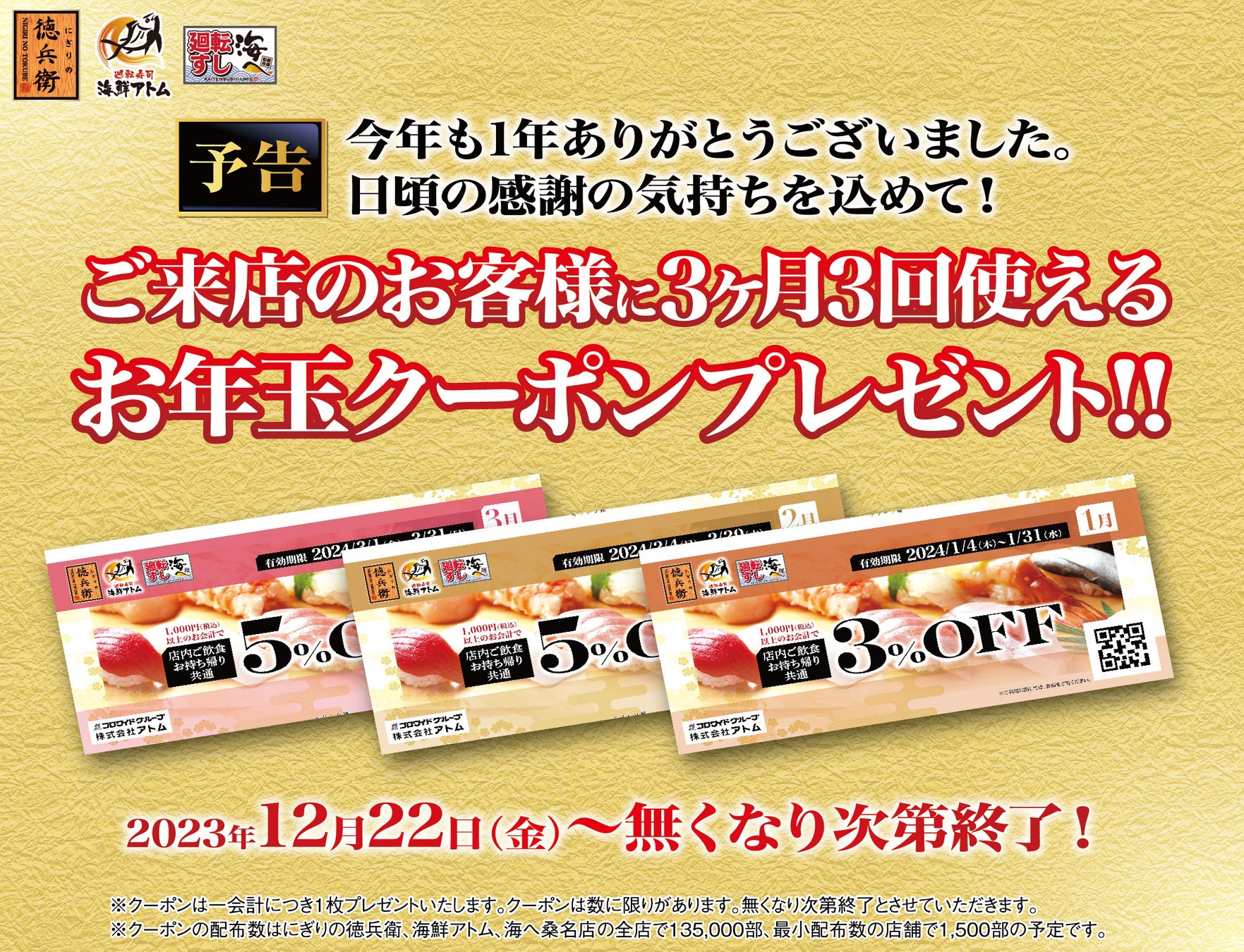 グルメ廻転寿司【にぎりの徳兵衛、海鮮アトム、海へ】今年も1年ありがとうございました。日頃の感謝の気持ちを込めて!ご来店のお客様に3ヶ月3回使えるお年玉クーポンプレゼント!!