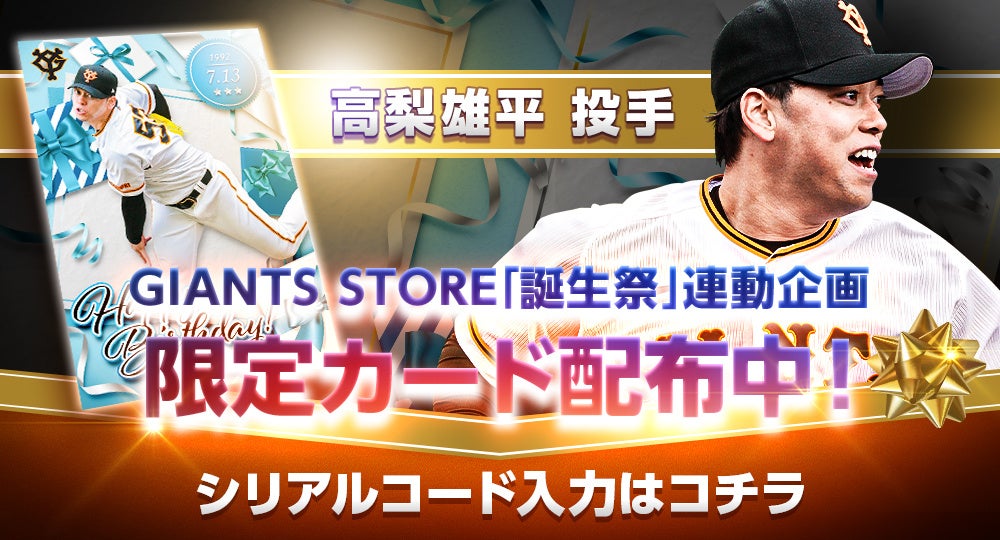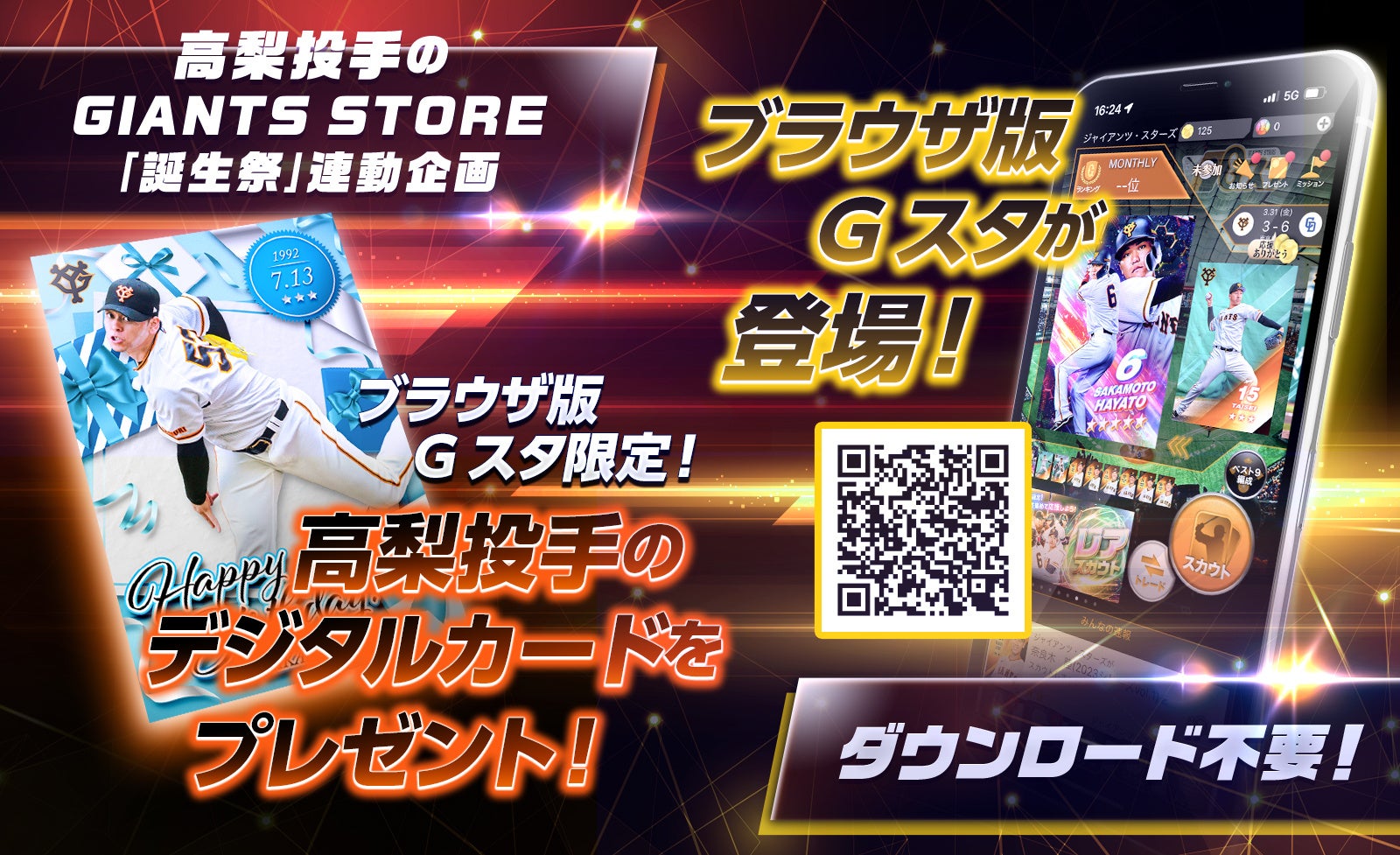 ダウンロード不要で遊べるブラウザ版Gスタが登場!さらに、ブラウザ版Gスタにて、高梨雄平投手のGIANTS STORE「誕生祭」に連動したデジタルカードプレゼント企画を実施