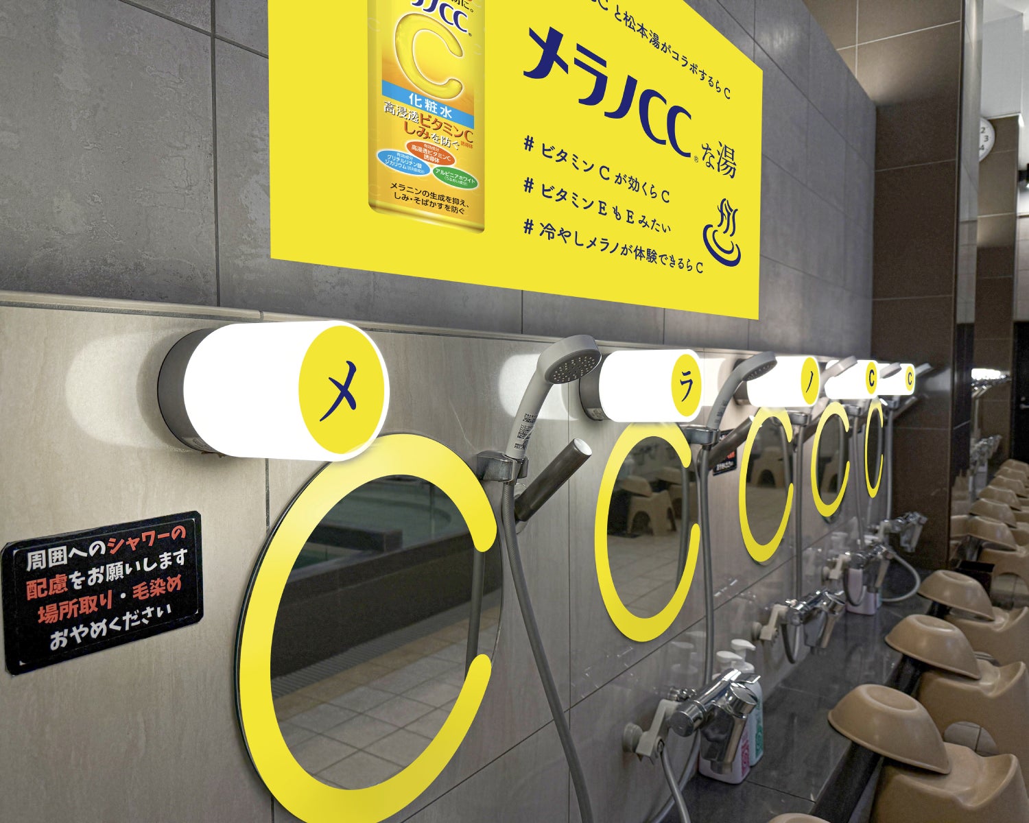ビタミンCを主成分としたメラノCCの世界観をイメージし、松本湯全体をメラノCC仕様にジャックします。期間中、お風呂上がりにメラノCCブランドの商品を体験していただけます。