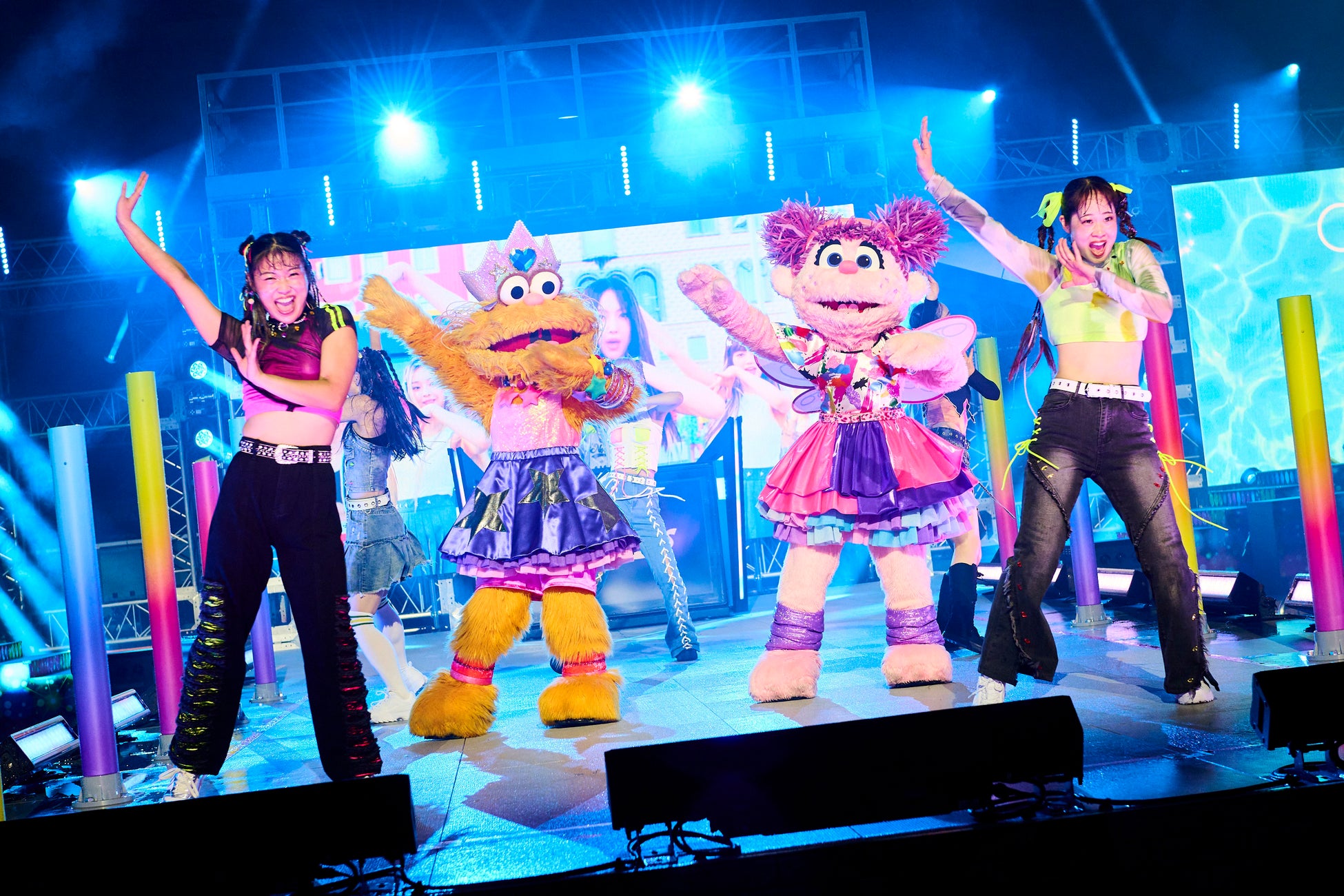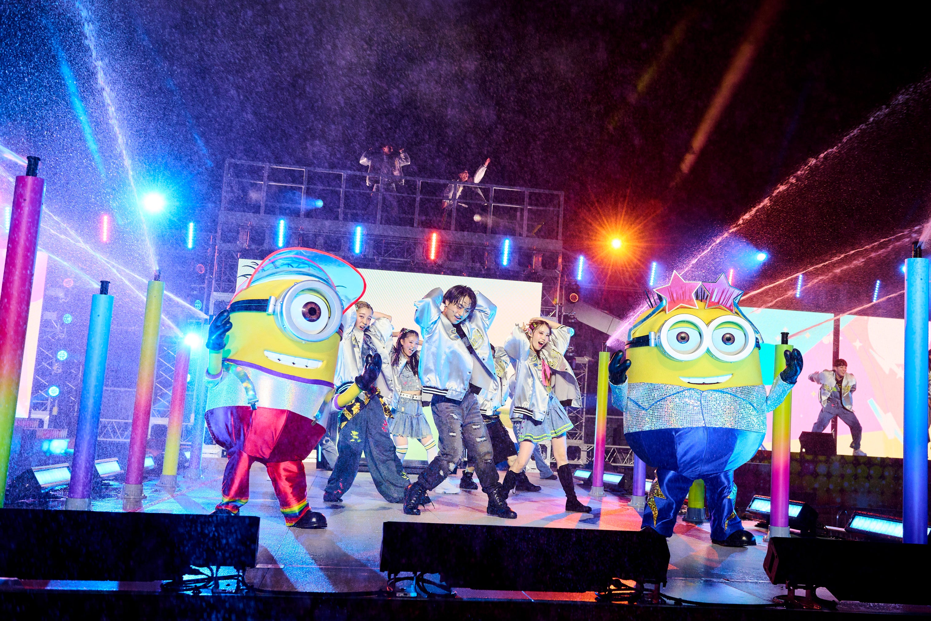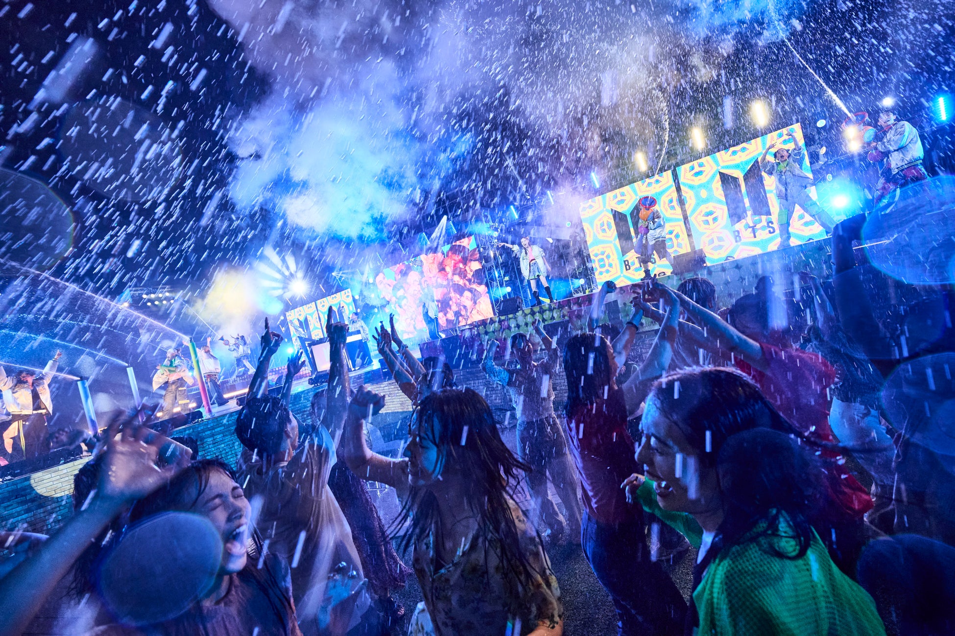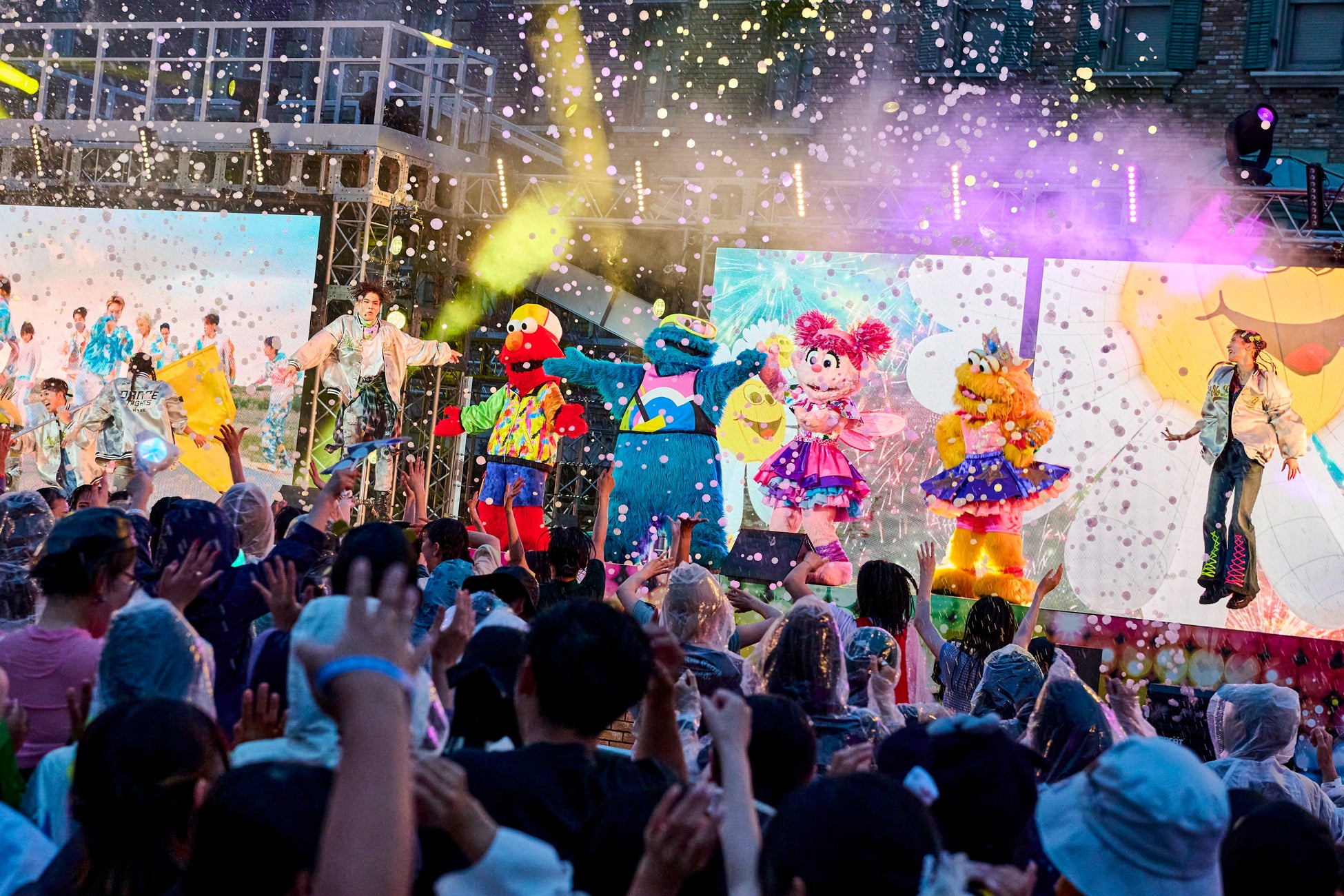 2日午後6:45ごろ、グラマシーパークの特設ステージで、『NO LIMIT! サマーダンスナイト with HYBE JAPAN』がスタートしました。HYBE LABELSのアーティストであるBTS、SEVENTEEN、TOMORROW X TOGETHER、ENHYPEN、LE SSERAFIM、NewJeans、&TEAM、BOYNEXTDOOのヒット曲が次々と大音量で響き渡り、巨大スクリーンにミュージックビデオが流れるなか、ダンサーたちが迫力のパフォーマンスを魅せると、会場から大歓声が巻き起こりました。BTSの「IDOL」、SEVENTEENの「Super」など世界的なヒットナンバーに合わせて、夜空を照らすライティング、ウォーターエフェクト、バブルマシーン、スモークなどの特殊効果で会場全体がド派手な演出で彩られました。ミニオン、セサミストリートの仲間たち、ハローキティたちがキレキレのダンスで沸かせ、会場を埋め尽くした1,500名の特別招待ゲストはスプリンクラーから降り注ぐ爽やかな水に包まれ“超興奮”の渦に全身で“DIVE”し、踊って歌って、心の底から弾けて、ユニバーサル・スタジオ・ジャパンだけの特別な夏の夜を存分に楽しみました。