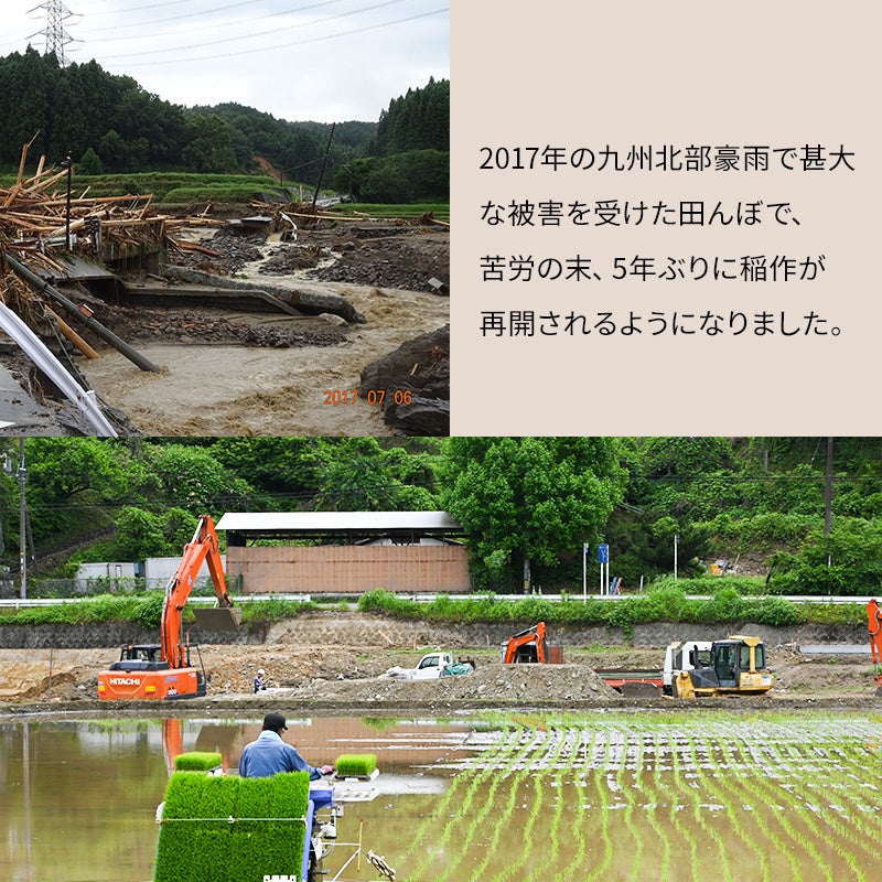 2017年に発生した「九州北部豪雨」により被災した水田で5年ぶりの作付け。復興を願い開発された新品種「恵つくし」の稲作を再開。