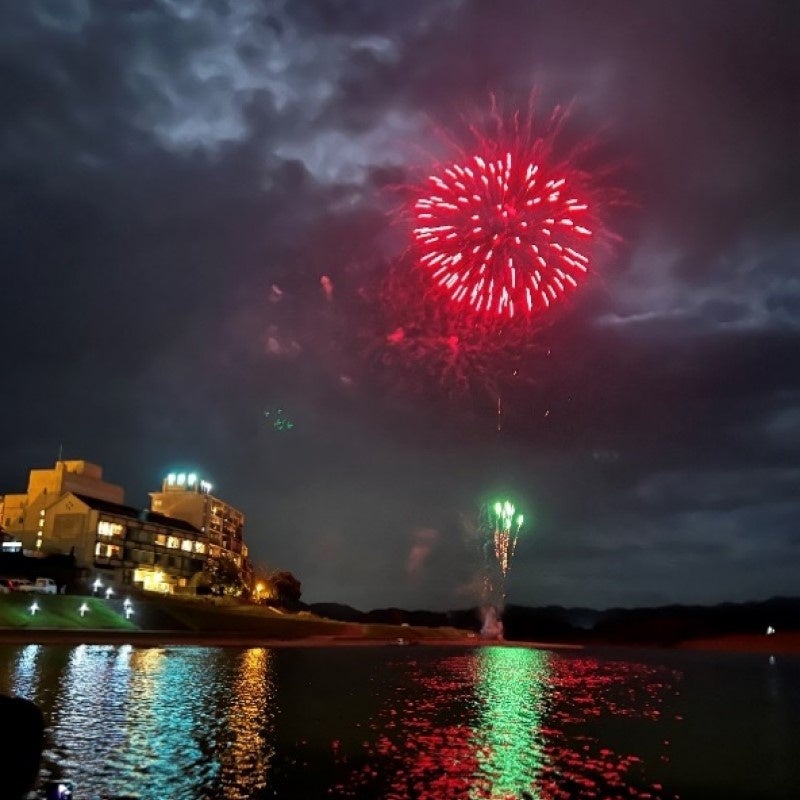 そこで昨年から原鶴温泉旅館協同組合では、「九州北部豪雨からの復興・コロナに負けてたまるか!」を合言葉に、「元気です!原鶴温泉」として不定期ながら原鶴温泉の宿泊のお客様へのサービス・おもてなし・賑わいとして、筑後川の河川敷で独自にサプライズ花火打上げを実施しています。