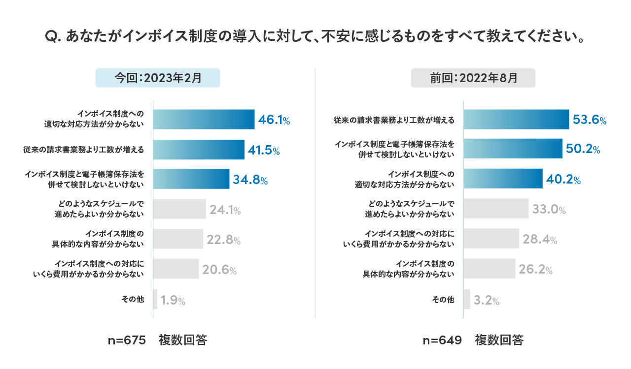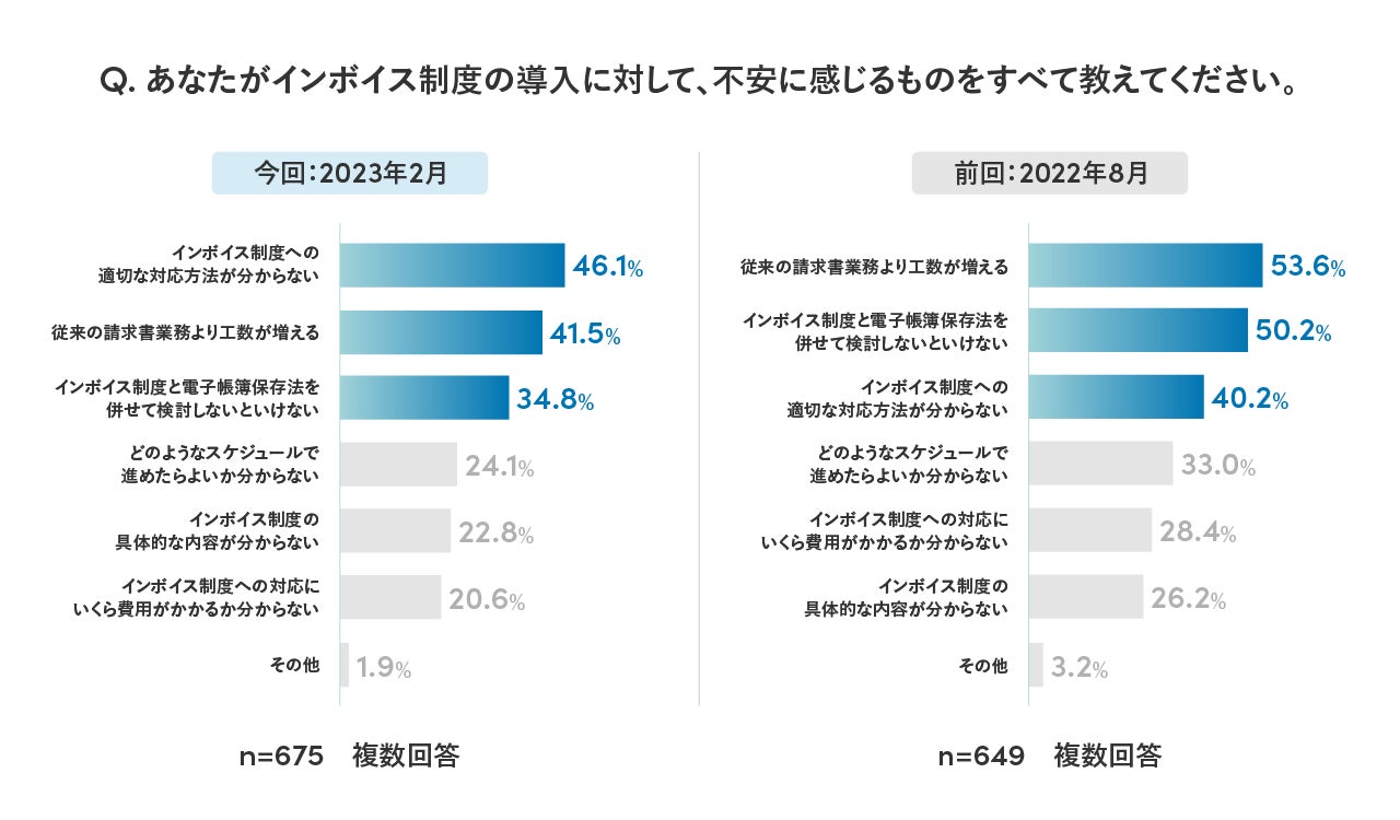 - 「インボイス制度への適切な対応方法が分からない」が最も多く、前回調査から上位三項目は変わらない結果に