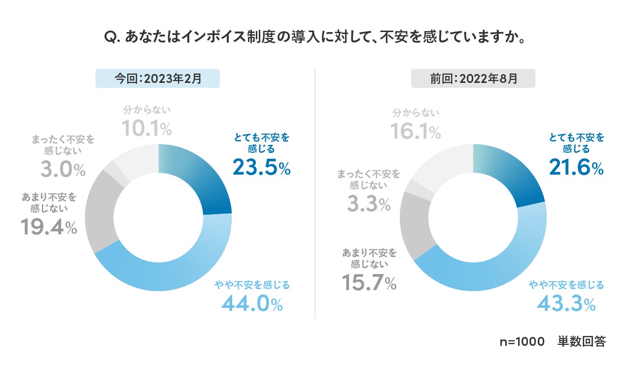 - インボイス制度に関する不安の声は約7割で、前回調査に引き続き不安を感じている