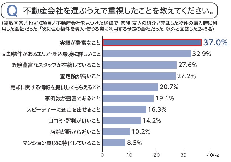 不動産会社を選ぶうえで重視したことは「実績が豊富なこと」が37.0%でトップでした。より希望に近い条件で売却をするために、不動産会社の実績を重視するようです。