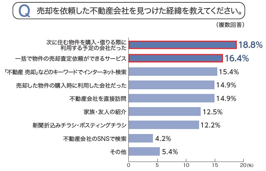 不動産会社を見つけた経緯については「次に住む物件を購入・借りる際に利用する予定の会社だった」が18.8%とトップになりました。次の住まい探しに軸を置いている人が多いようです。次いで「一括で物件の査定依頼ができるサービス」が16.4%でした。