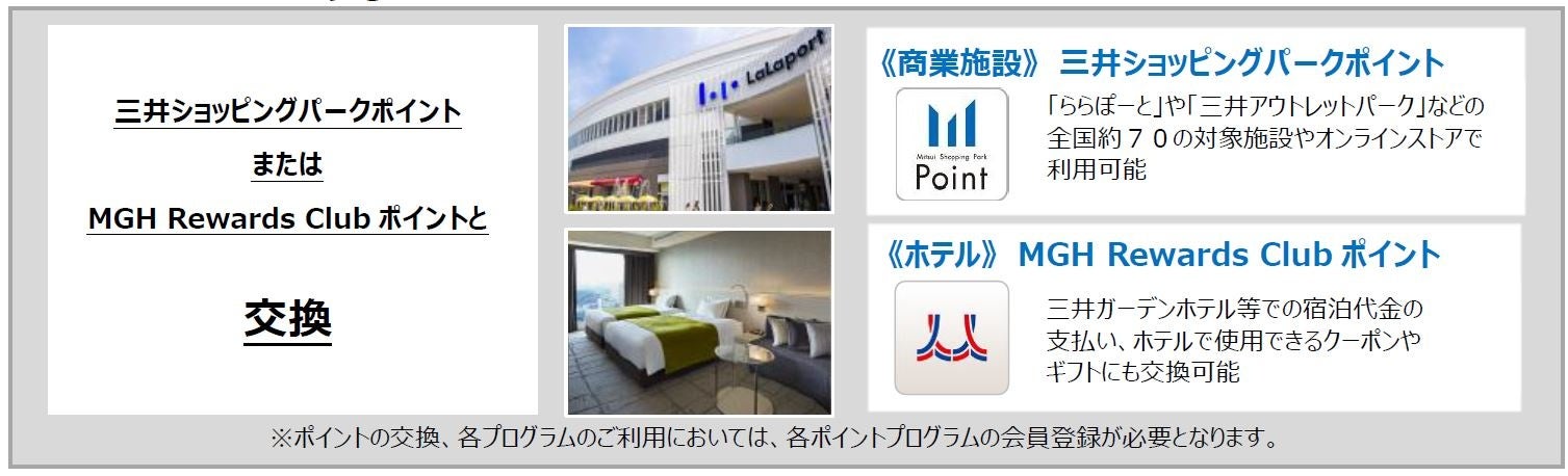 「三井のすまいLOOPポイント」と「MGH Rewards Clubポイント」間においての相互ポイント交換および「三井のすまいLOOPポイント」または「MGH Rewards Clubポイント」を「三井ショッピングパークポイント」に交換することが可能となります。