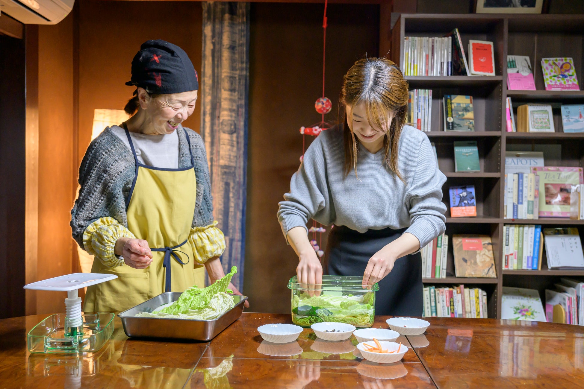 オカン達が住む木之本町は、伝統的な漬物が盛んな地域です。当プログラムでも、地元で採れた野菜、オカンが作る食材や木之本の酒、醤油、糀などを使って発酵食品をつくります。例えば、春には春キャベツと実山椒で作るザワークラウト、夏になると、オカンの畑で採れたきゅうりとミョウガの発酵柴漬け、冬は木之本のゆずを使ったゆず塩こうじなどがあります。オカン達は普段から発酵食品をつくる文化を大切にしており、その時期の地元の旬な食材を使って発酵食品にしているため、どんな素材を使用するかは当日までのお楽しみです。タイミングによってご案内するオカンも変わるので、時期を変えて訪れるとまた違った体験が楽しめます。また、作り方はオカンが手取り足取り教えてくれるので初めての方でも安心。つくった発酵食品は、長浜・木之本で発酵させて、食べごろになったタイミングでご自宅へ届けることも可能です。