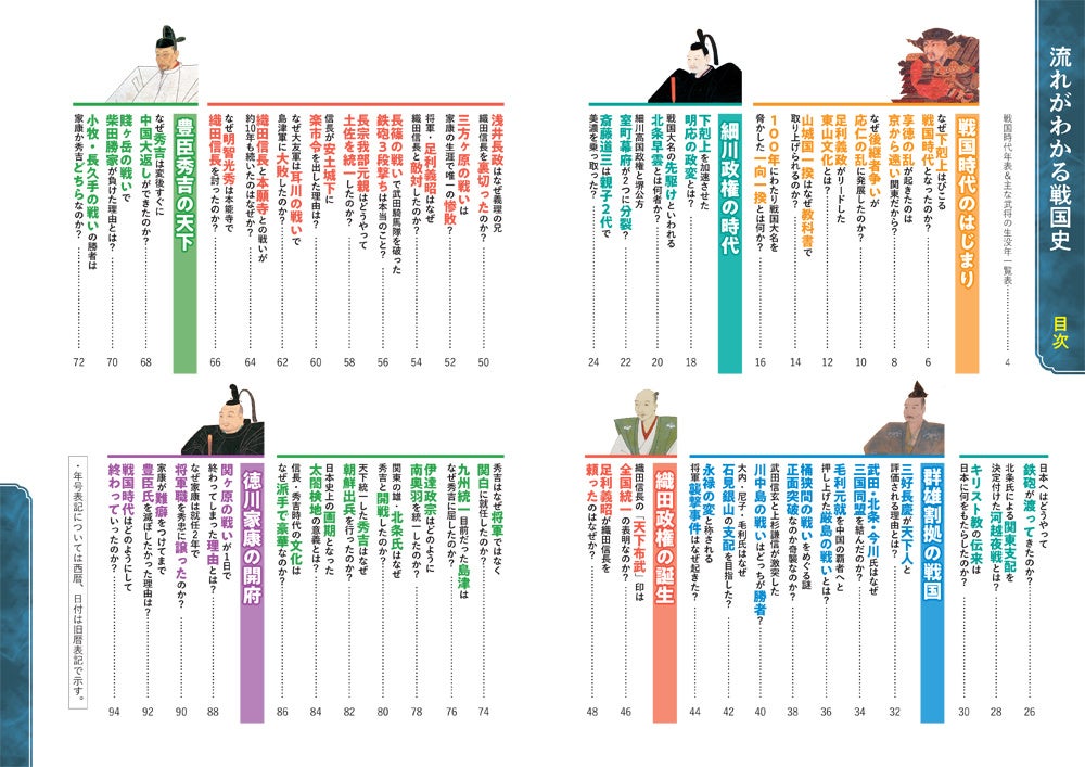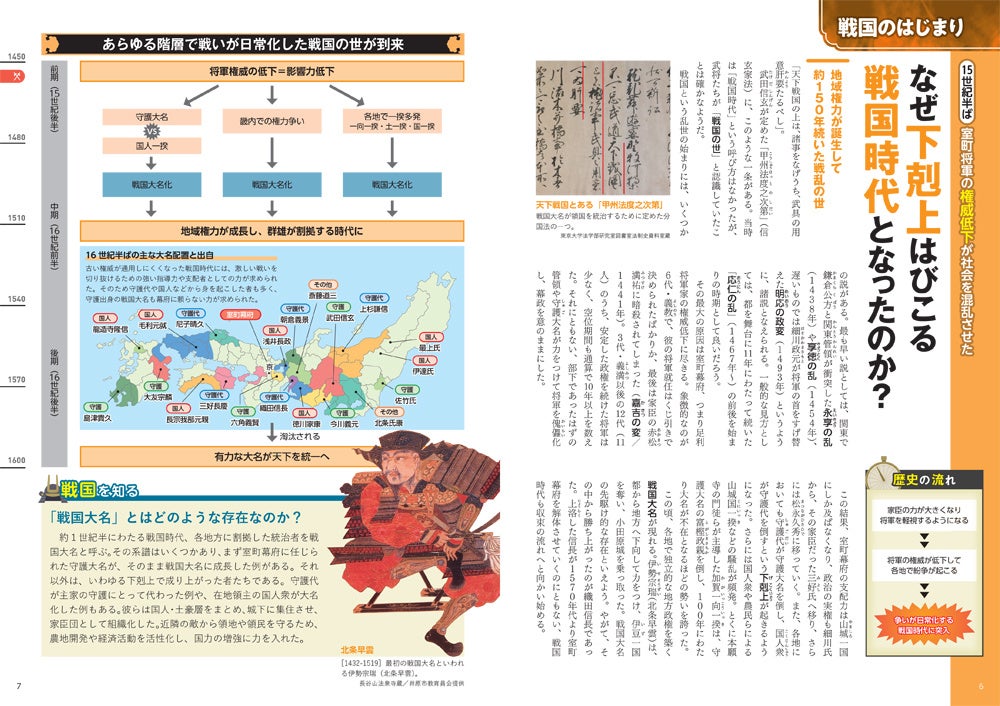 『オールカラー図解 流れがわかる戦国史』は、見開きワンテーマで戦国時代の幕開けから終焉までをやさしく解説しているので、そんな大きな流れを押さえておくのに最適の本です。