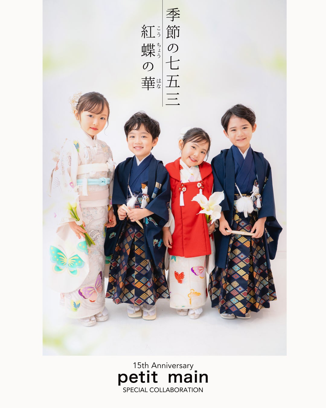 季節の七五三「petit main “紅蝶の華”」は、「和」と「洋」を織り交ぜた装いを提案するプティマイン初の着物コレクションです。三歳・七歳の女児着物に加え、初めて男の子衣装も展開し、きょうだい撮影にも対応します。