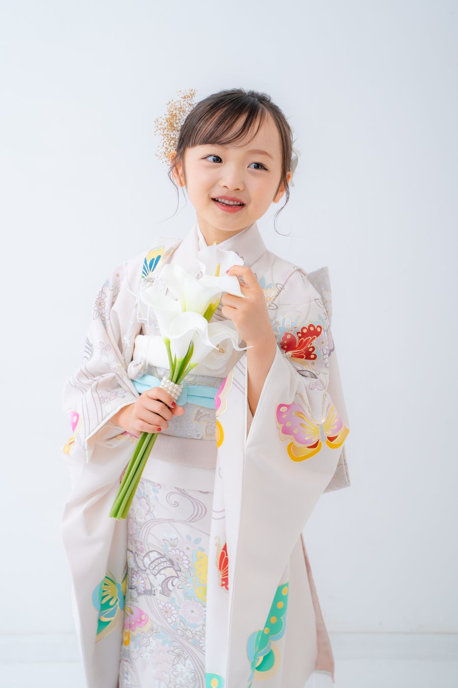 繊細な柄と白帯で品よくまとめ、七歳らしい気品と落ち着きを演出します。