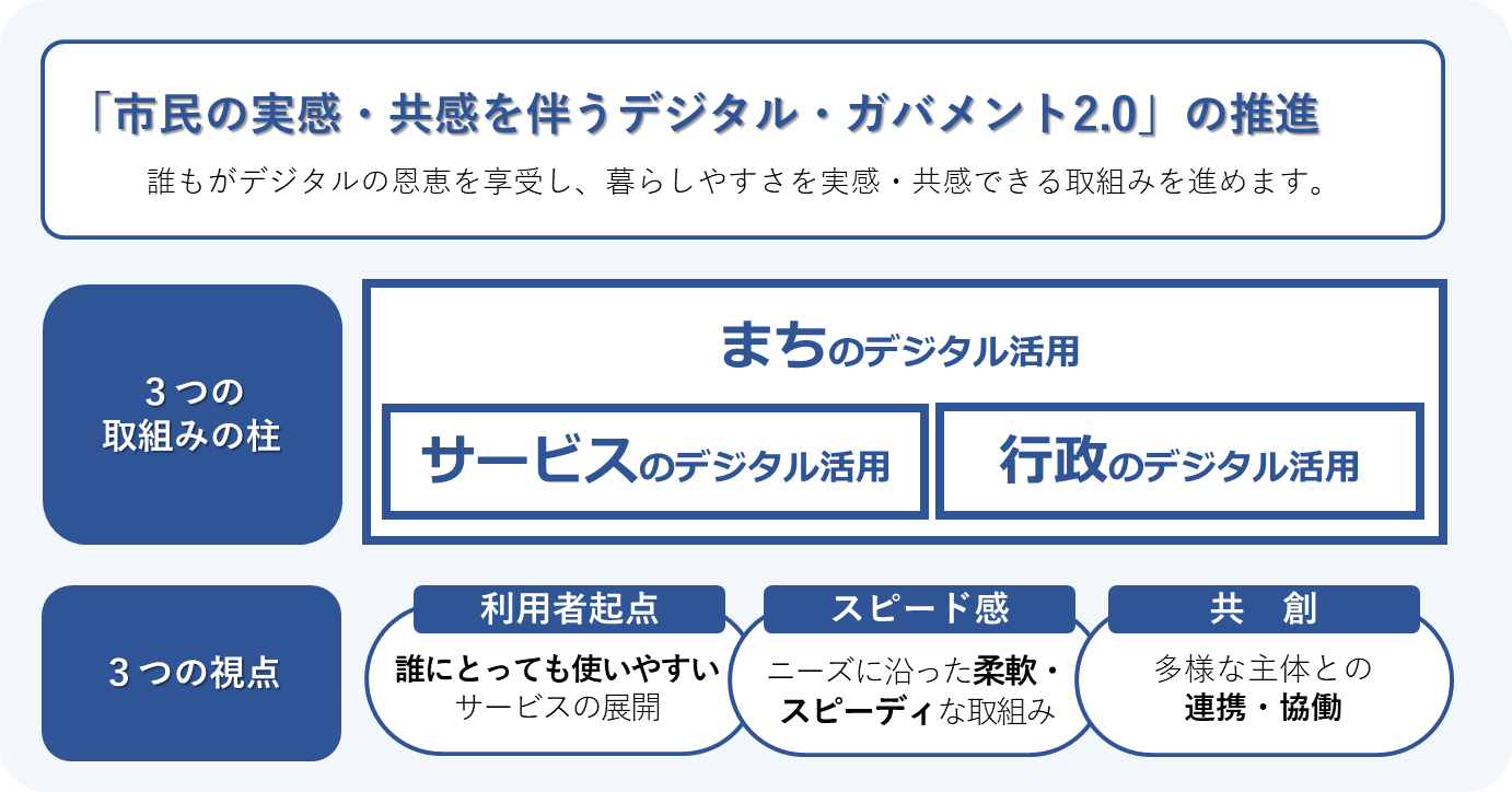 これまでの取り組みを基礎として、本市のデジタル・ガバメントの取り組みをより良いものにバージョンアップさせるため、『とよなかデジタル・ガバメント戦略2.0』を本日策定しました。市民の皆さんが暮らしやすさを実感・共感できるよう、【まちのデジタル活用】【サービスのデジタル活用】【行政のデジタル活用】の3つを取り組みの柱として推進します。