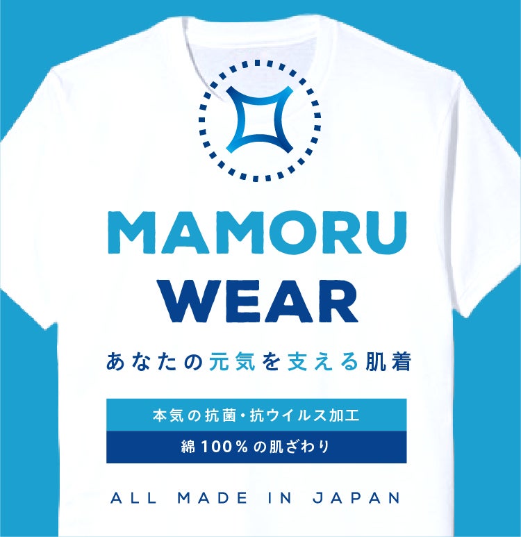 あなたの元気を支える肌着「MAMORU WEAR」。ウイルス・菌・ニオイを99%カットする特殊な生地を使用しています。日本人の体型に合わせたシルエットで、Yシャツを着た時に美しく気心地のよい仕立てになっています。小さなお子さんがいる方、仕事で忙しい方、敏感肌の方に愛用いただいています。