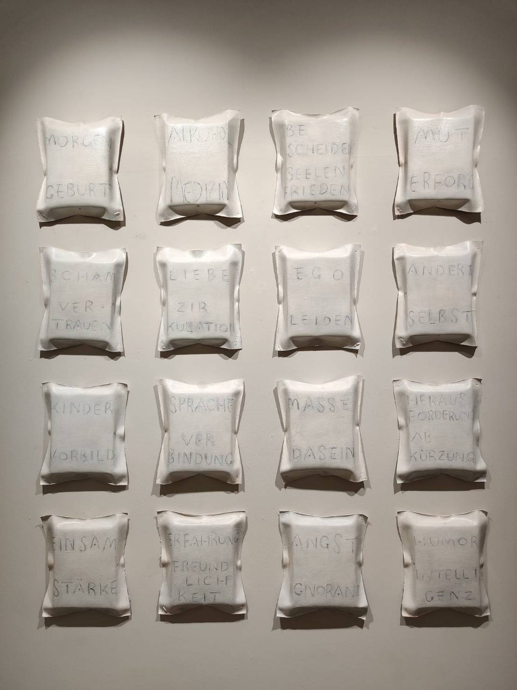 「Morgen – Geburt(朝 – 誕生)」「Sprache – Verbindung(言語 – つながり)」「Erfahrung – Freundlichkeit(経験 – 優しさ)」など、個人の体験から浮かぶ単語の組み合わせが、ミニマルなフォーマットに静かに描かれます。