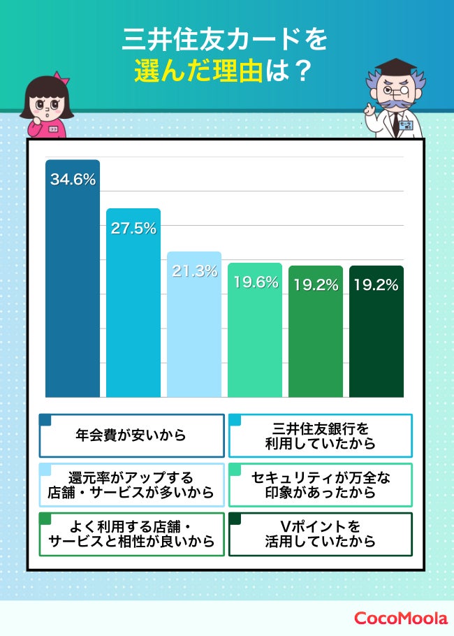 三井住友カードを選んだ理由TOP3は「年会費が安いから」「三井住友銀行を以前から利用していたから」「ポイント還元率がアップする店舗・サービスが多いから」。