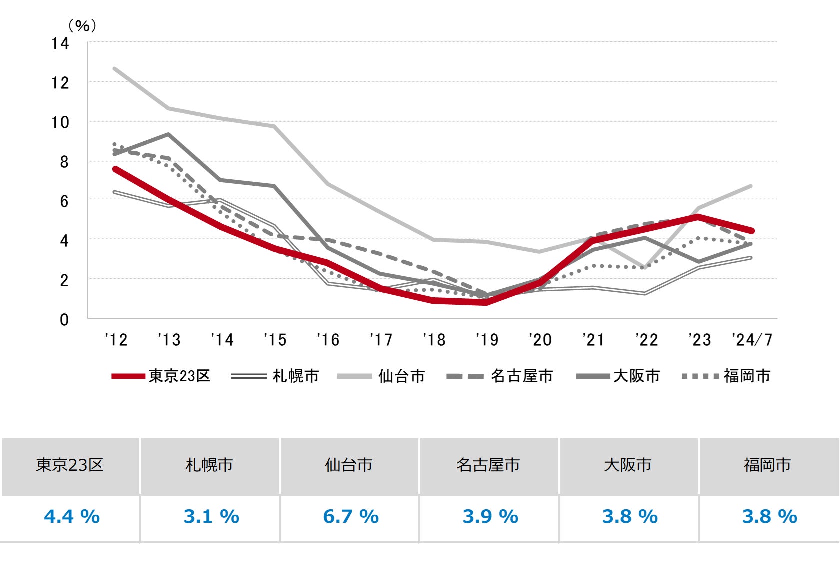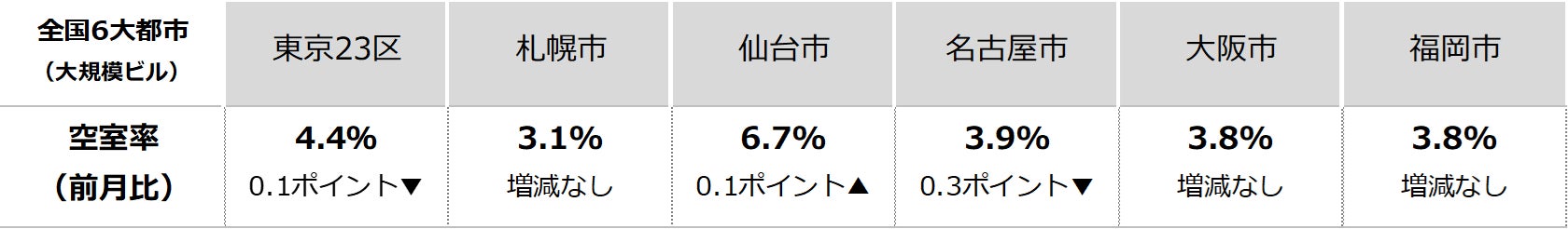 三幸エステート株式会社(本社:東京都中央区、取締役社長:武井重夫)は、2024年7月度の東京都心5区(千代田区、中央区、港区、新宿区、渋谷区)および全国6大都市(東京、札幌、仙台、名古屋、大阪、福岡)の大規模ビル※1のマーケットデータをまとめた「オフィスマーケット2024年8月号」を公表します。