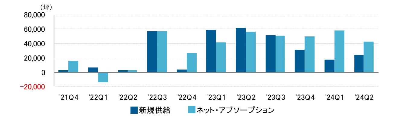 ネット・アブソープション(吸収需要)はオフィス需要の指標であり、一定期間におけるテナント入居面積(稼働面積)の増減を表す。2023年第1~第3四半期は、都心部での大量供給を背景に供給過剰となったものの、2023年第4四半期からは3期連続で需要が供給を上回る需要超過となっている。