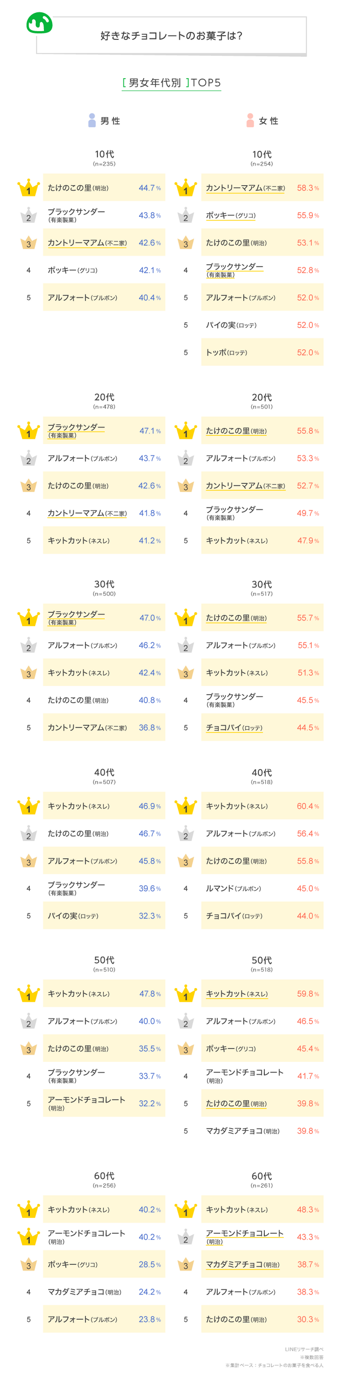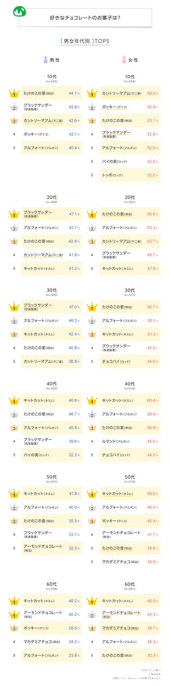 全体1位は「キットカット(ネスレ)」、2位は「アルフォート(ブルボン)」、3位は「たけのこの里(明治)」となり、すべて4割台で並ぶ結果となりました。