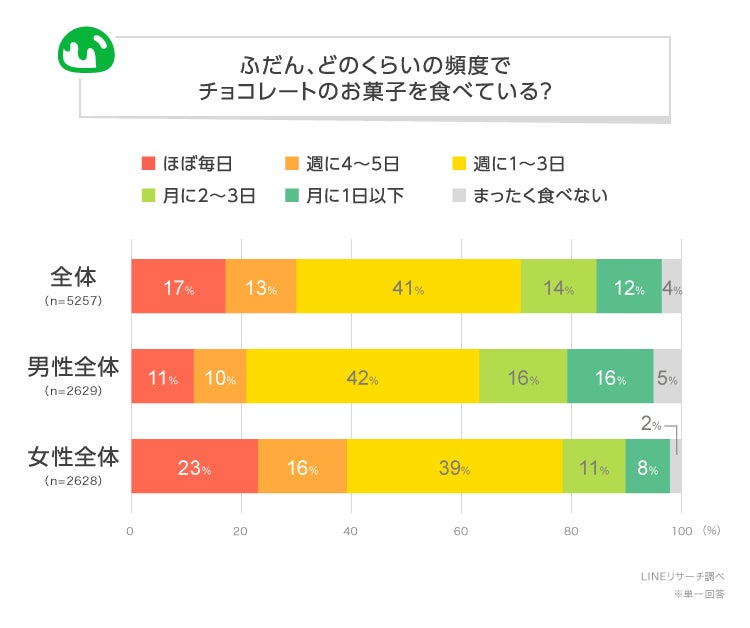このたびLINEリサーチでは、全国の10〜60代の男女を対象に、チョコレート菓子を食べる頻度や、好きなチョコレート菓子ついて調査しましたので、その結果をお知らせします。
