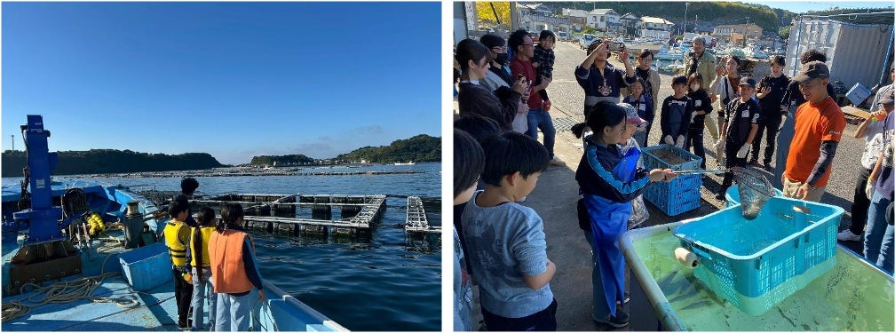 2025年11月23日(日)秋晴れの長崎県雲仙市南串山町の京泊漁港に集まった「日本さばける塾in雲仙」の参加者である小学生14名は、株式会社天洋丸の養殖サバ(ニボサバ)のイケスを見学しました。初めて見るサバの青さや、煮干しを餌として与える際のサバの泳ぐスピードの速さに参加者一同驚きました。また陸上に戻り、あらかじめ用意しておいた水槽で泳ぐサバを、網を使っての捕獲体験には逃げ回るサバの水しぶきに歓声があがりました。また捕獲したサバを、針金を使ったり、首を折ったりする鮮度を保つ締め方を学びました。
