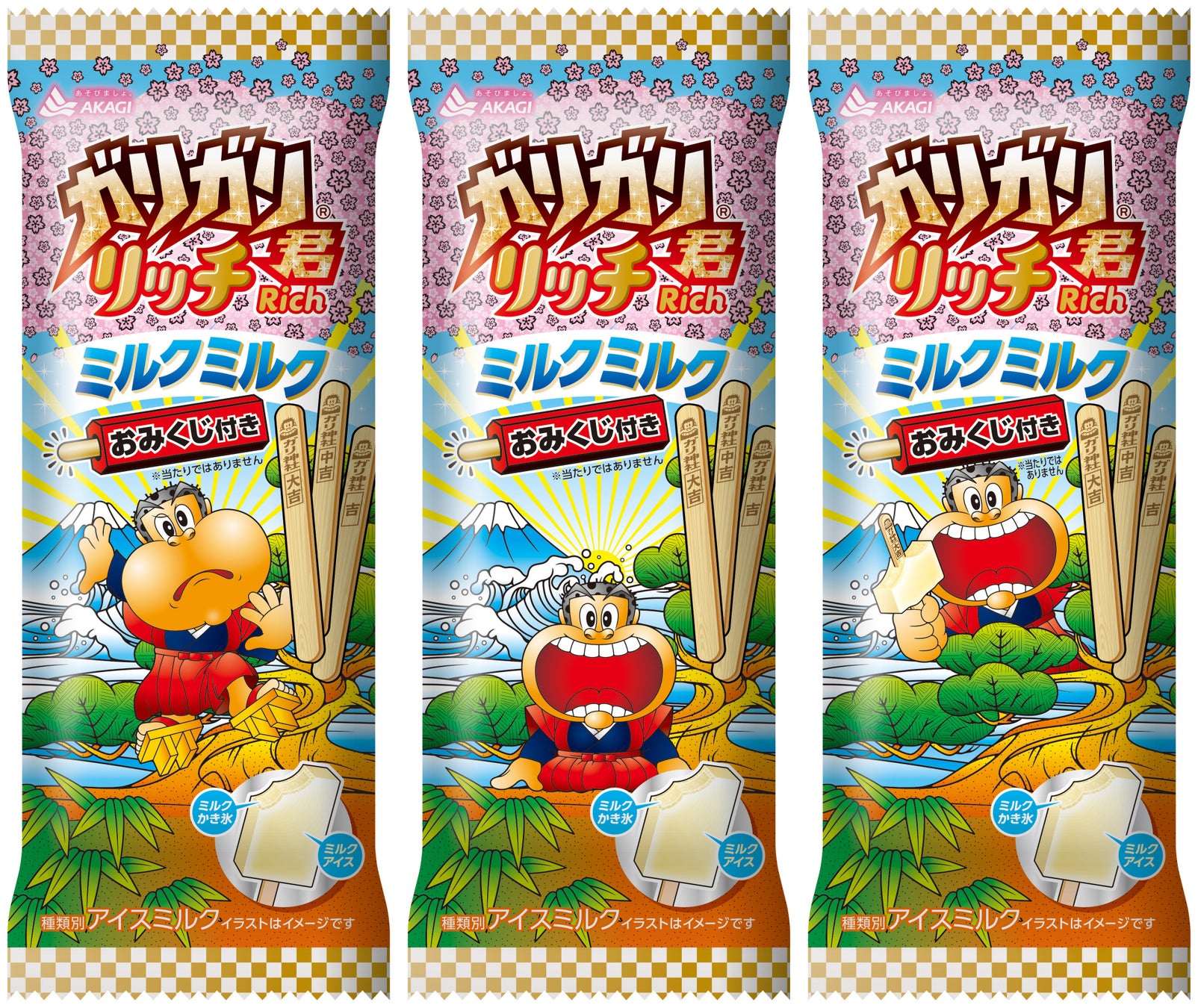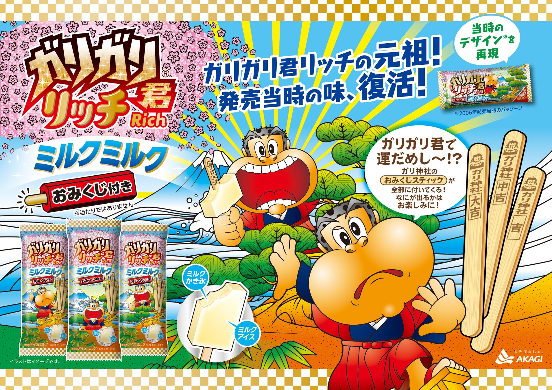 今回の「ガリガリ君リッチミルクミルク」は、2006年にガリガリ君リッチシリーズとして初めて発売した「ガリガリ君リッチミルクミルク」の企画を復活させた商品で、パッケージやおみくじスティックを再現し、ミルクアイスの中に、濃厚なミルクかき氷を入れたアイスキャンディーです。