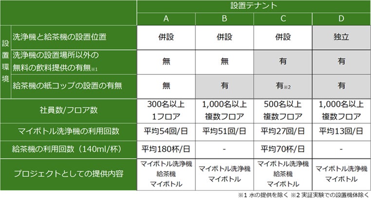 本プロジェクトでは、象印マイボトル洗浄機の設置と無料飲料の提供によりマイボトルが自然と手間なく使える環境の構築を行う「テナント向けプログラム」を実施し、利用環境の整備がマイボトルの利用状況に与える影響を確認しております。