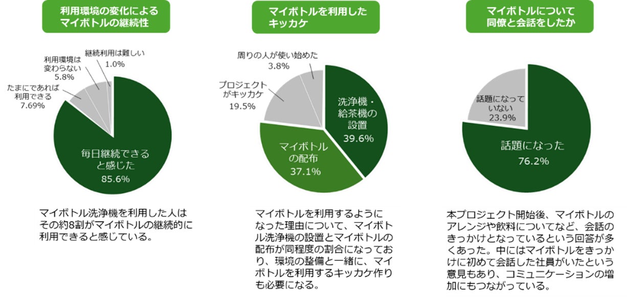 なお、本プロジェクト期間中に76.2%の社員がマイボトルのアレンジや飲む飲料などを話題としており、マイボトルの利用が社員間のコミュニケーションの増加にも寄与していると考えられる。