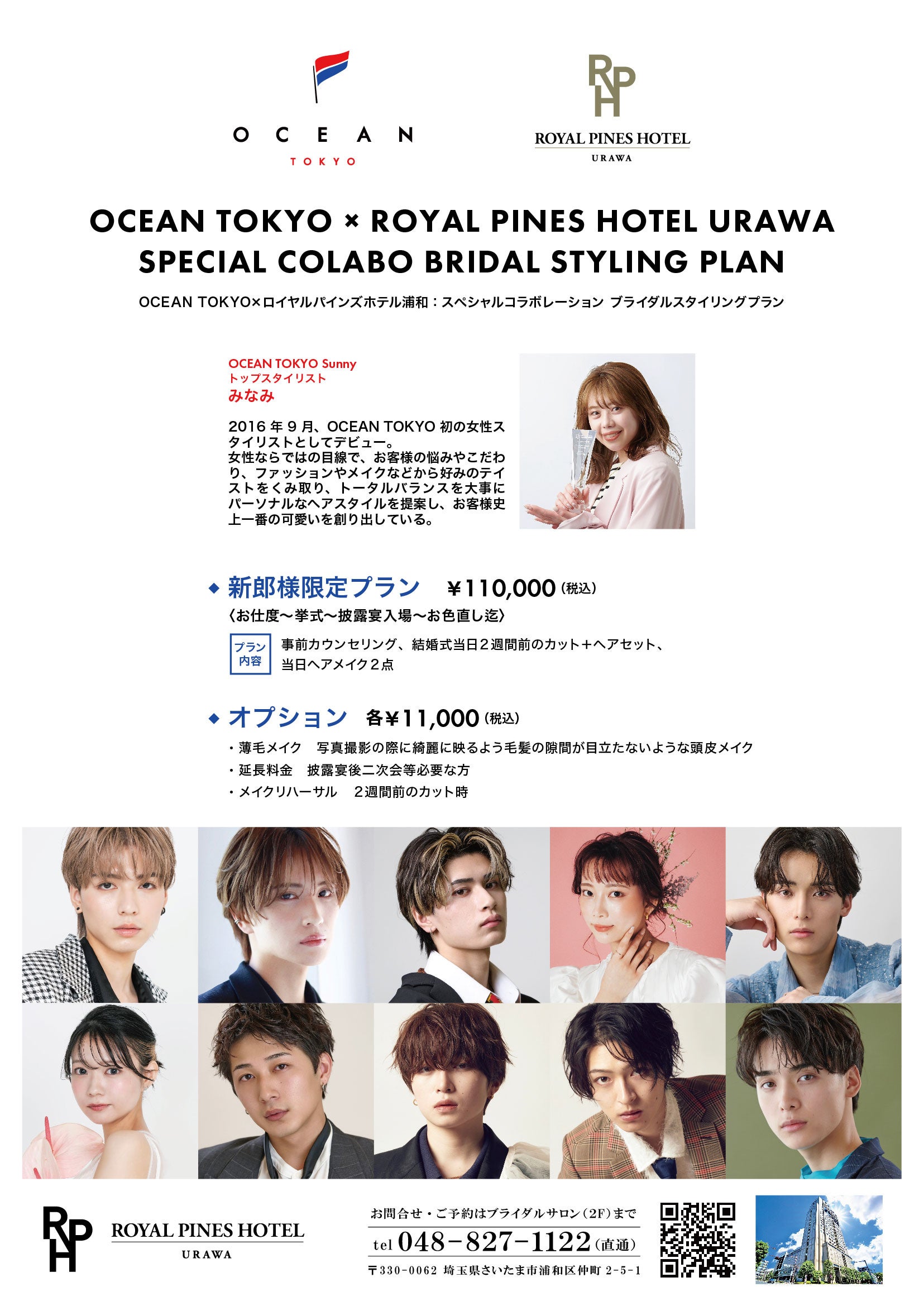 日本の美しいチャペルベスト100にも選出された開放的なガーデンチャペルを備え、ウェディングの口コミランキング総合1位※を獲得するなど、埼玉県を代表するフルサービスホテル「ロイヤルパインズホテル浦和」と、新たな美容師・美容室のあり方と価値を創造し、本物の技術と美容師の枠を超えたエンターテイメント集団「OCEAN TOKYO」による日本初のウェディング企画「スペシャルコラボレーション ブライダルスタイリングプラン」は、OCEAN TOKYO Sunnyのトップスタイリスト みなみ が新郎のヘアスタイリングをプロデュース、人生最幸の日を最高の自分で迎えるお手伝いをします。