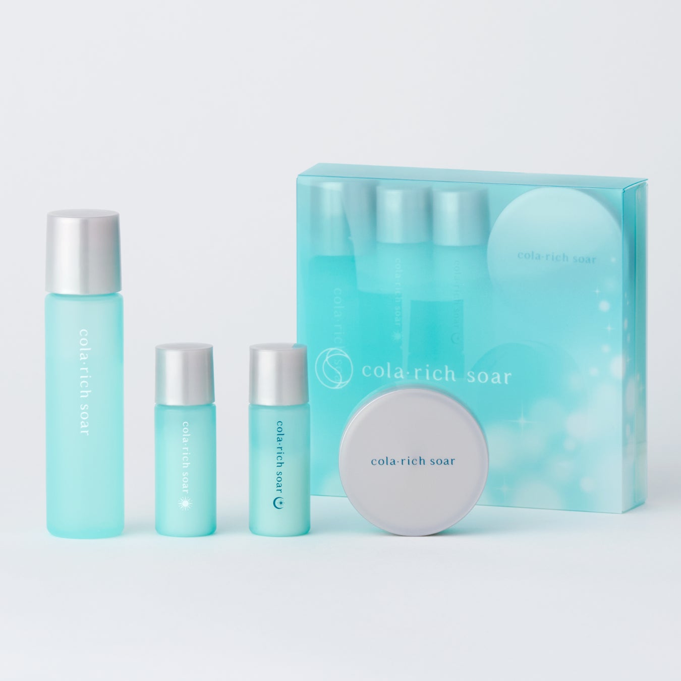 コラリッチ ソアの全ラインナップをお試しいただける、トライアルセット(約7日分)を発売いたします。まずは7日間、朝夜時間別ケアの新習慣をお試しいただき、コラリッチ ソアが叶える24時間コラーゲン(※2)ケアの効果をぜひご体感ください。