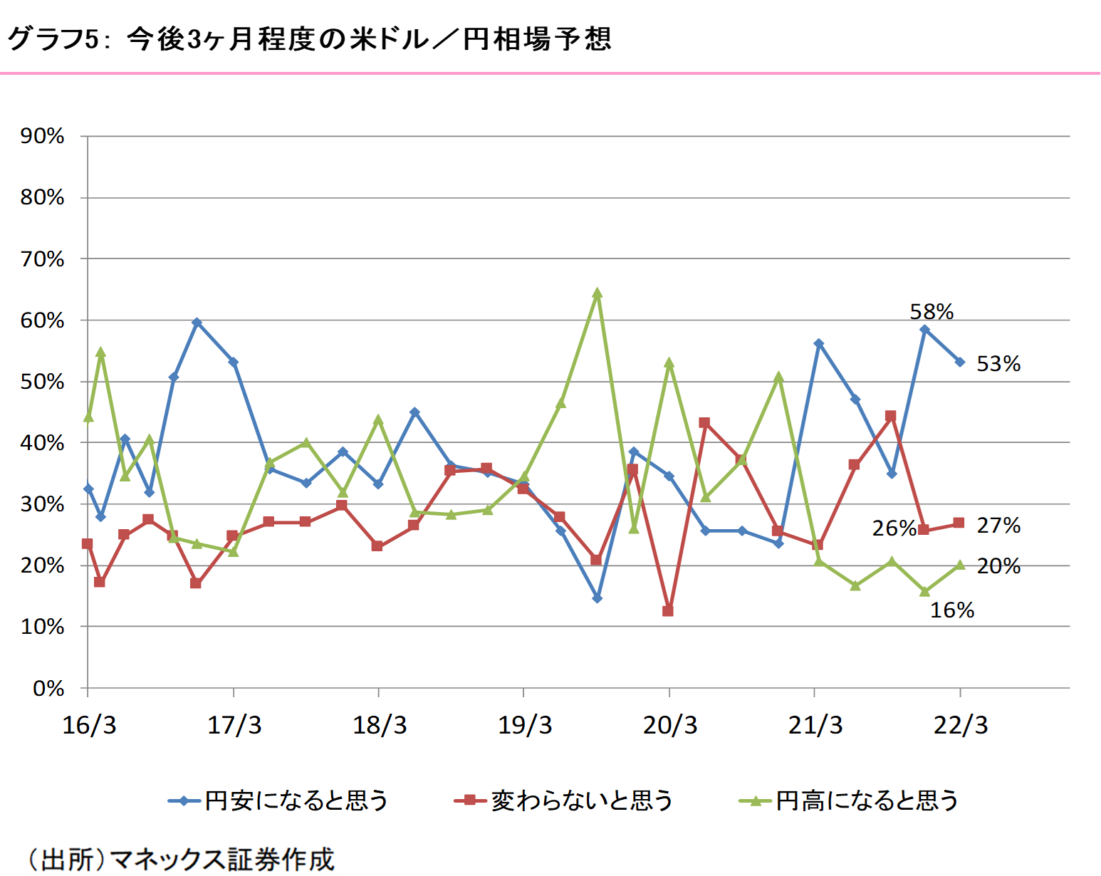 【円安になると思う】(2021年12月)58% →(2022年3月)53%(前回比- 5%)