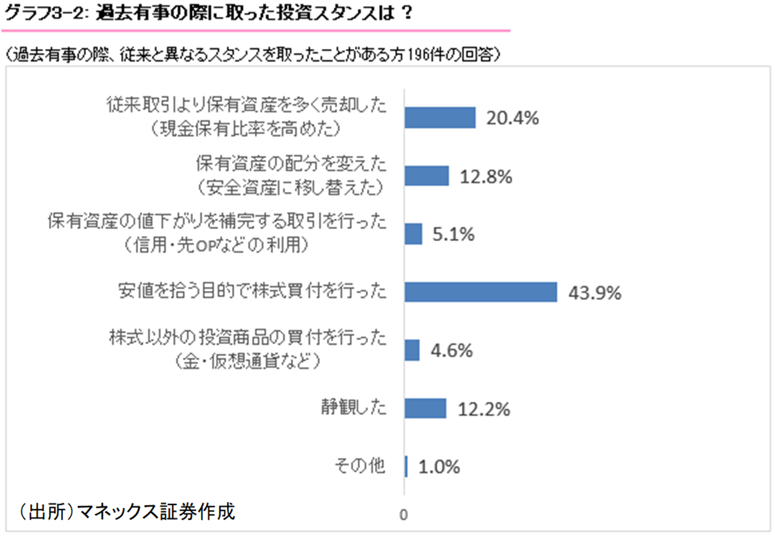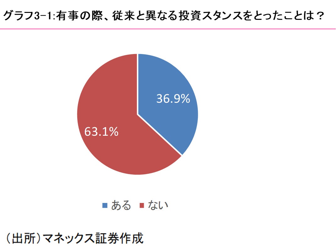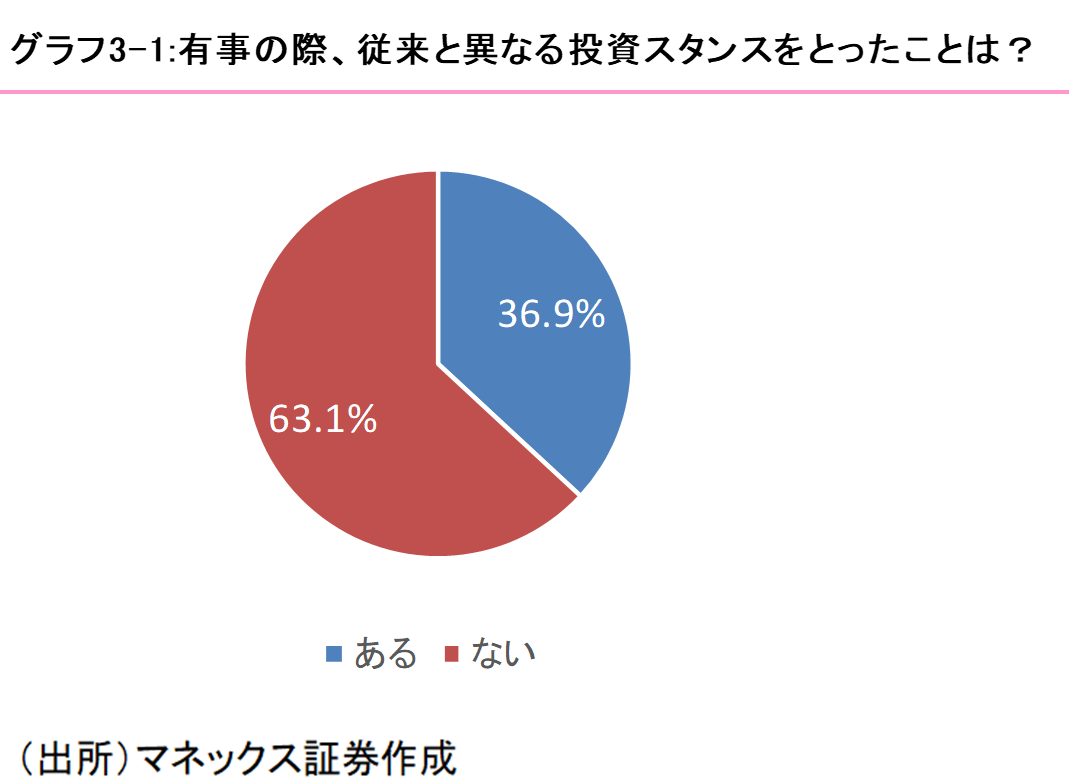 過去『有事』と一般的に呼ばれた時、従来とは異なる投資スタンスをとったことがあるか」をたずねました。「ある」と回答した割合は36.9%、「ない」と回答した割合は63.1%で多くの投資家がスタンスを変えたことがないと回答しました。