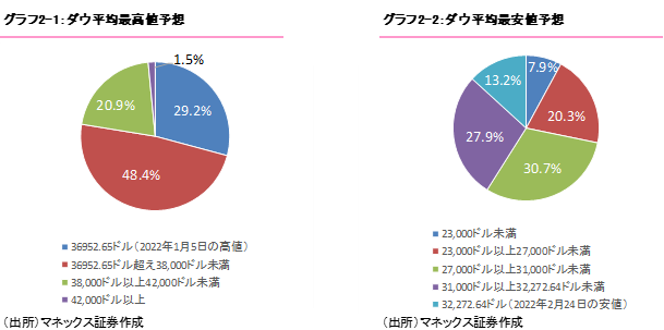 1-2. 2022年のダウ平均株価見通し、高値予想は「36952.65ドル超え38,000ドル未満」が最多