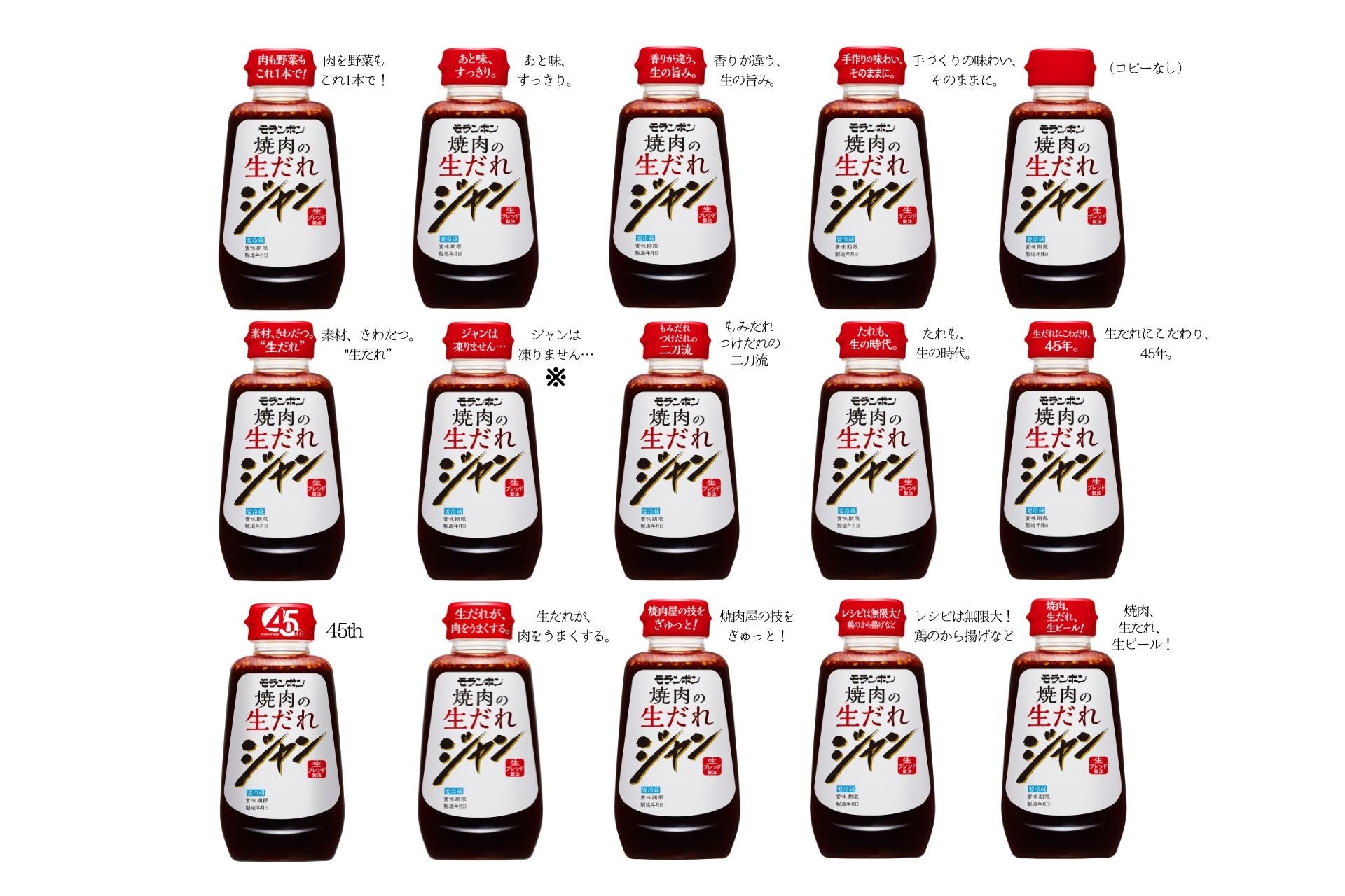 5月中旬より「ジャン 焼肉の生だれ240g」のボトルキャップ部分がランダム15種類のキャッチコピーとなります。社内公募により選定され、「ジャン 焼肉の生だれ240g」の商品特徴や生だれの価値を伝える内容となっております。