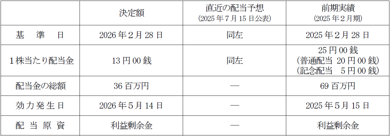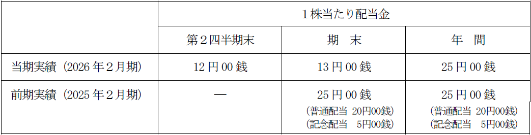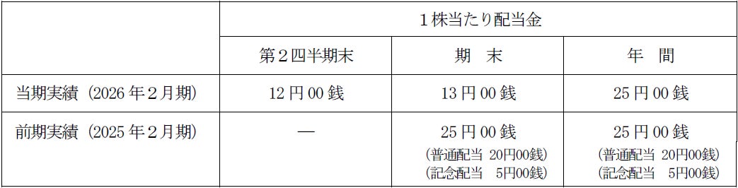 2025年7月15日付の「配当方針の一部変更(中間配当の実施)及び配当予想の修正に関するお知らせ」にて公表いたしましたとおり、株主の皆様への利益還元の機会を充実させることを目的として、2026年2月期より中間配当と期末配当の年2回の剰余金の配当を実施しております。