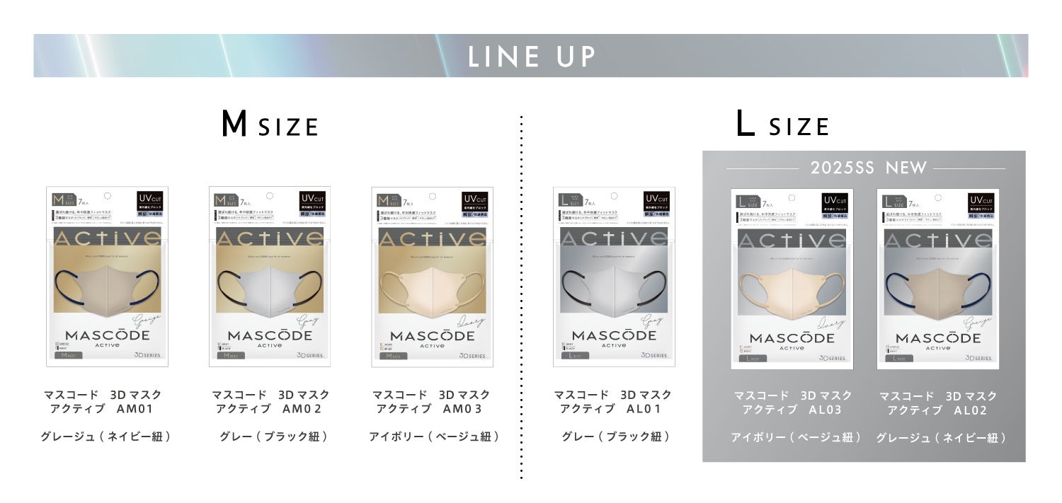 株式会社サン・スマイル(本社:東京都港区/代表取締役社長:田中徳也)はファッション性と機能性を両立させたマスクブランド『MASCODE(マスコード)』より、2023年春夏から展開しておりました「MASCODE Activeシリーズ」から、好評につき、Mサイズのみの展開だった人気カラー「アイボリー(ベージュ紐)」と「グレージュ(ネイビー紐)」に、待望のLサイズの展開が加わり、より多くの皆様にご着用いただけます。2月3日より公式オンラインストア(https://sunsmarche.jp/)にて先行発売、4月21日より一般発売をいたします。