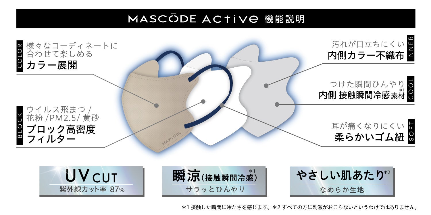 「MASCODE(マスコード)」は、ファッション性と機能性を両立させ、「マスクにドレスコードを」というコンセプトでTPOや服装、その日の気分に合わせてマスクを選び、組み合わせる新しい楽しみを提供してまいりました。そんな新たなマスクのスタイルを提案するブランドとして、「MASCODE Activeシリーズ」は会話が増えるシーンや、屋外でマスクを使用する場合の不快感を軽減し、Activeに行動するときに嬉しいシリーズです。