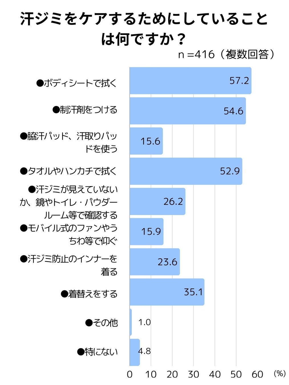 汗ジミをケアするためにしていることでは、「ボディシートで拭く」(57.2%)が最も多く、次いで「制汗剤をつける」(54.6%)、「タオルやハンカチで拭く」(52.9%)という結果となりました。多くの人が制汗剤などを用いた事前の対策だけでなく、汗をかいた後のケアも行っていることがうかがえます。