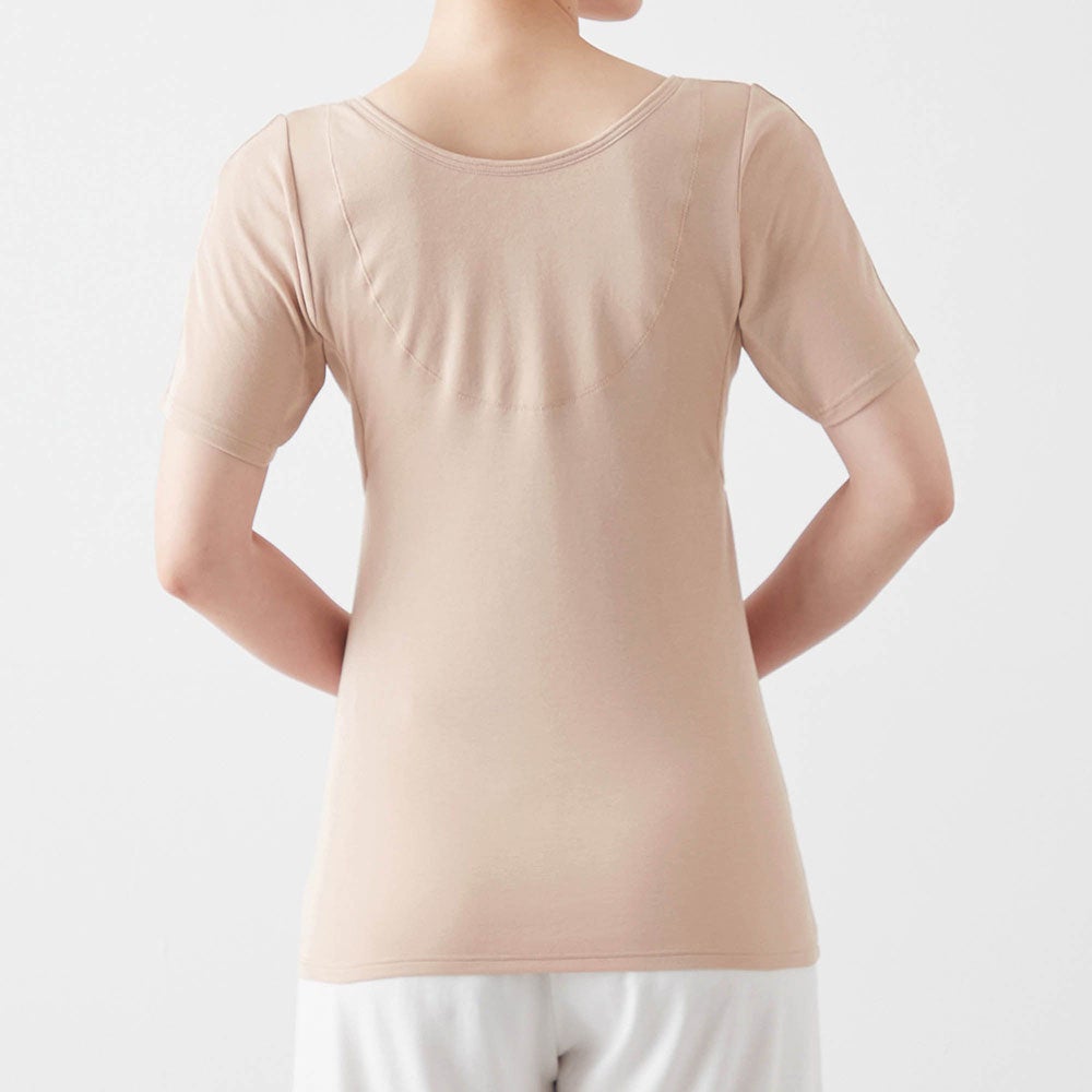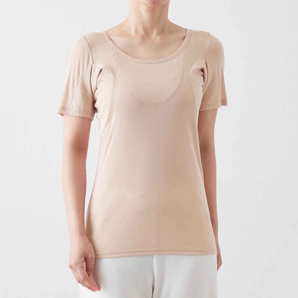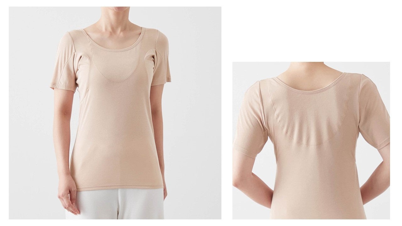 脇だけでなく背中上部と胸元にまで防水布を内蔵した三分袖のインナー