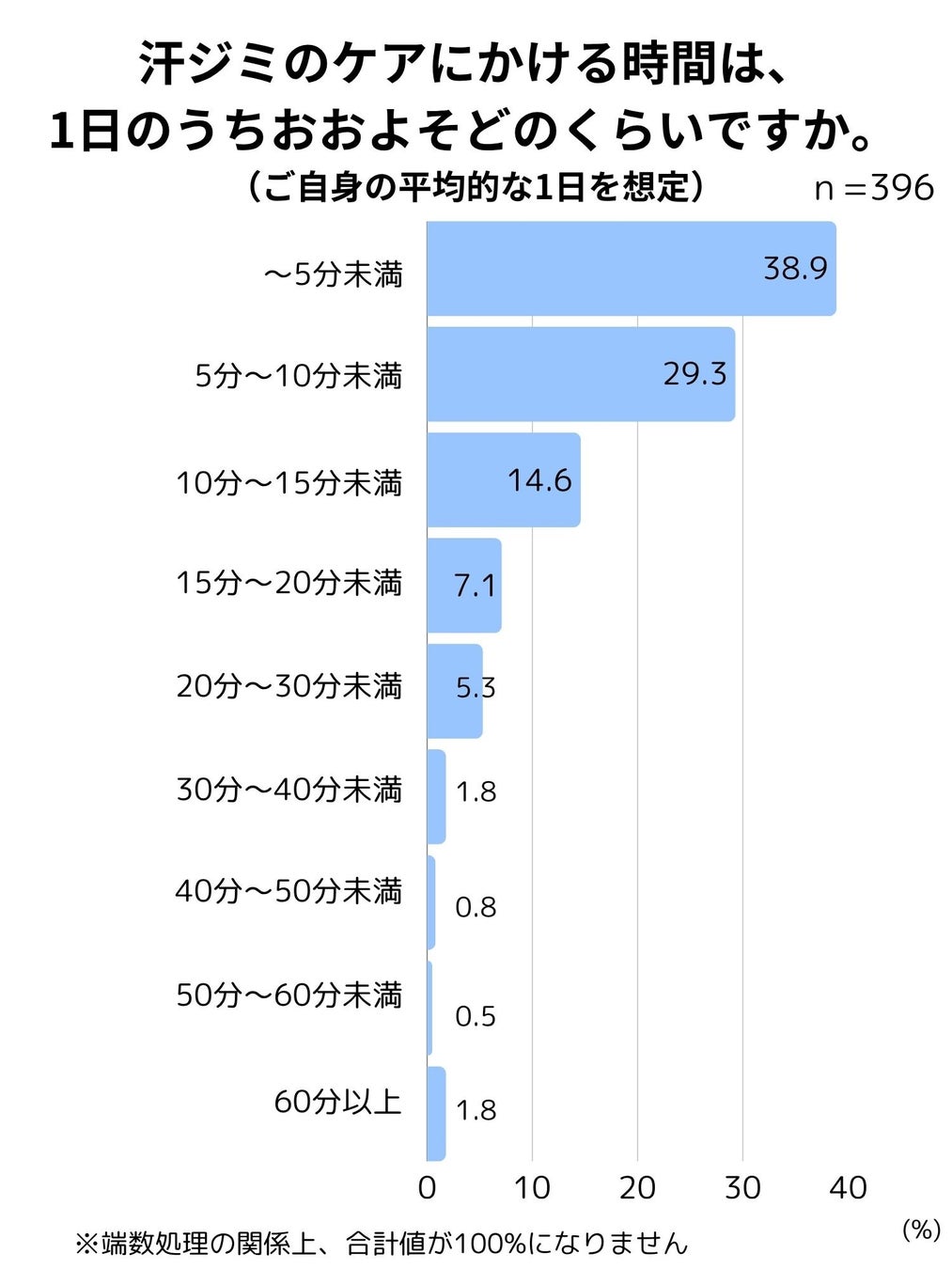 また汗ジミのケアに費やす時間について聞いたところ、汗ジミをケアする時間に1日10分以上費やしている人は全体の約3割にのぼりました。1日10分であっても、1ヶ月で約5時間になります。さらに、1日60分以上費やすと回答した人も1.8%おり、程度の差はあれど、多くの人が汗ジミ対策に一定の時間を費やしているという実態が判明しました。