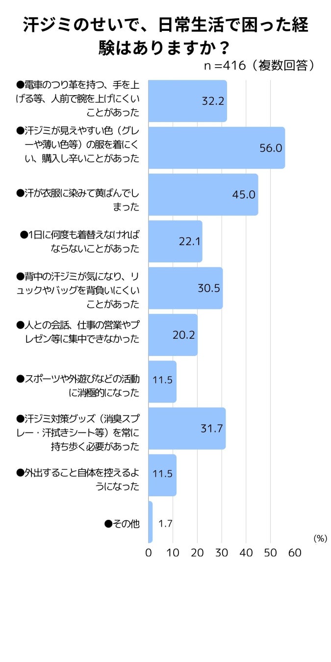 ・ファッションの制限:「汗ジミが見えやすい色の服を着にくい、購入しづらいことがあった」(56.0%)