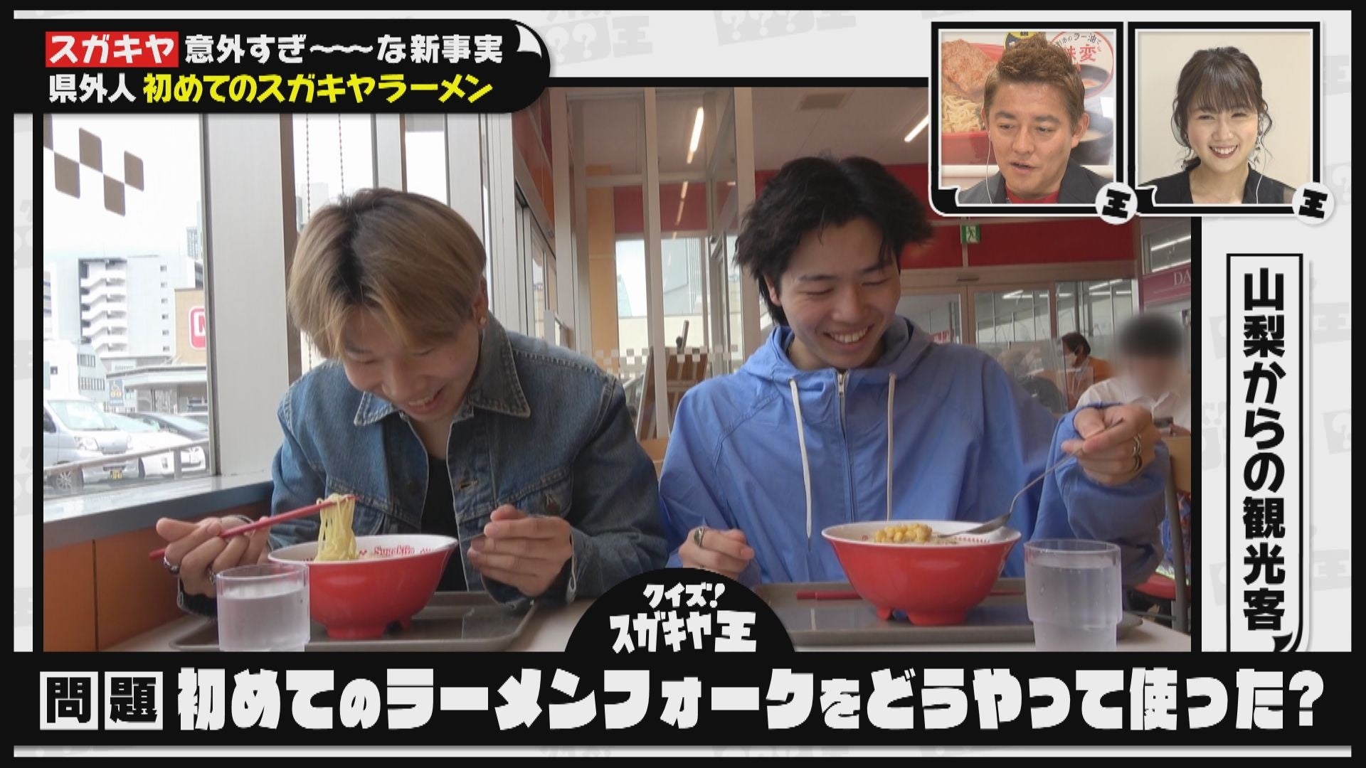 神奈川から来ていた観光客の初めてのスガキヤにカメラが密着!スガキヤのカップ麺は食べたことがあるが、店には行ったことがないという女性。とにかくスガキヤに行くのが楽しみで仕方ない女性が、店内に入り思わず笑ってしまったスガキヤの秘密とは・・・。また、ライブを見るために山梨から来ていた2人の男性は初めてラーメンフォークを見てびっくり!一体どうやって使ったのか??