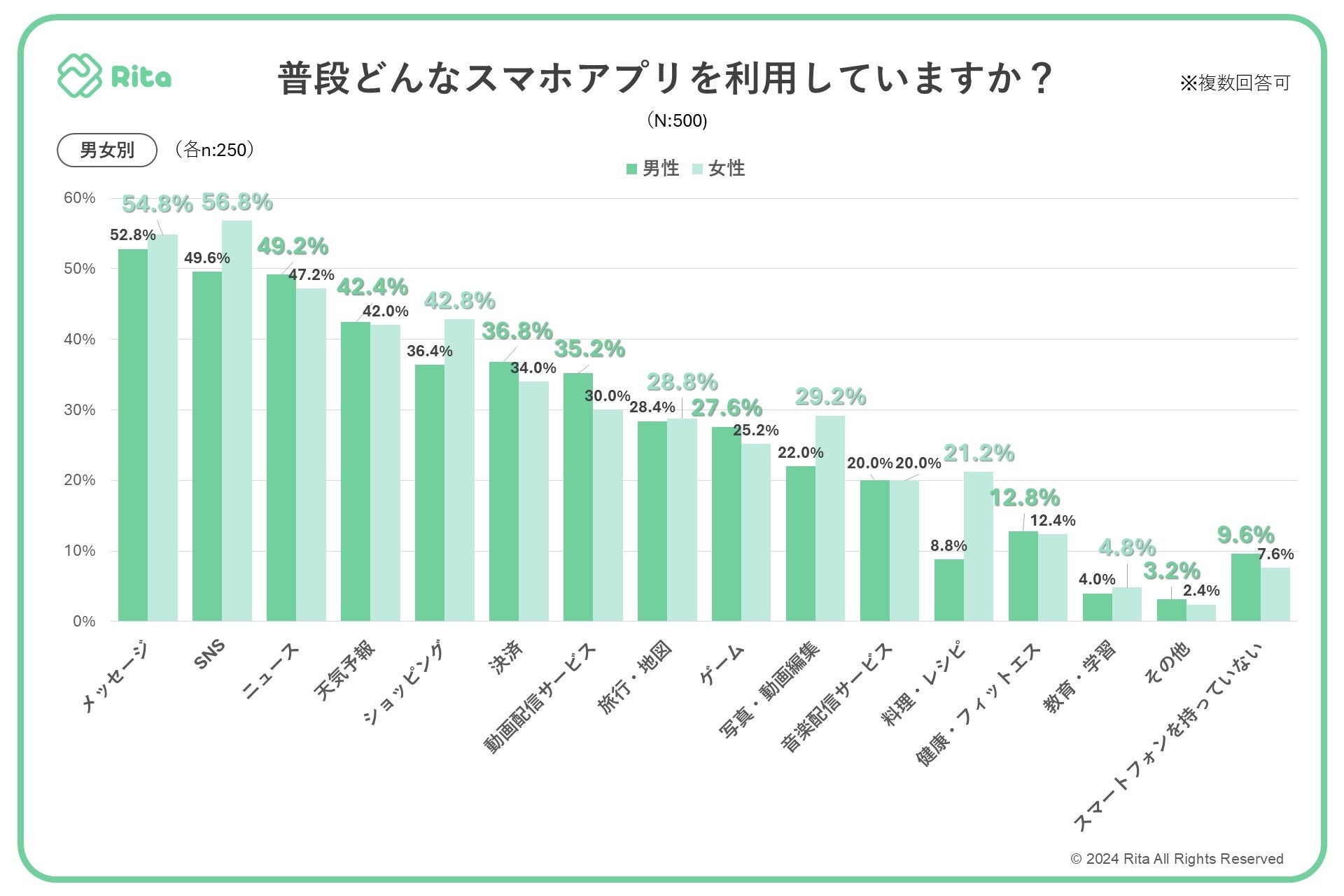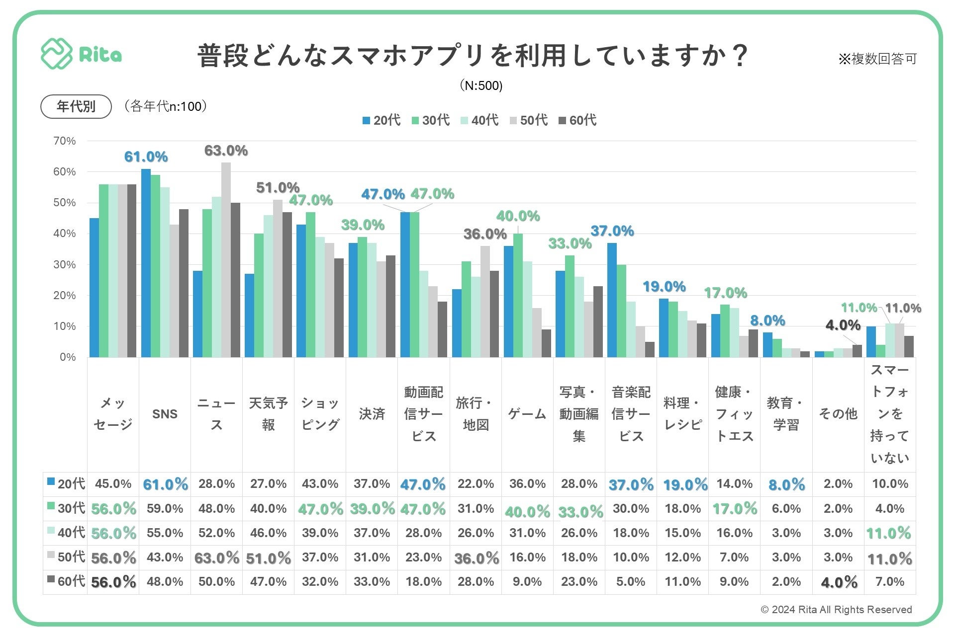 株式会社フォーイットの子会社で、リアルアフィリエイト広告プラットフォームを運営するRita株式会社は、全国の20代~60代までの男女500人を対象にスマートフォンに関するアンケートを実施し、年代別等の特徴についてまとめました。
