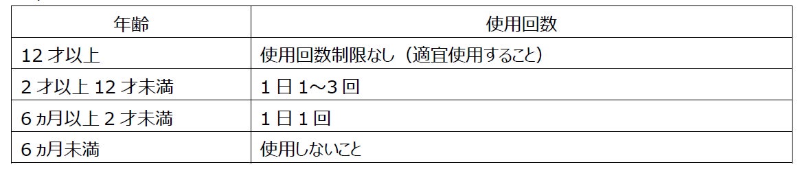 ※子ども(12才未満)に使用させる場合には、保護者等の指導監督の下で、上記の回数を目安に使用してください。なお、顔には使用しないでください