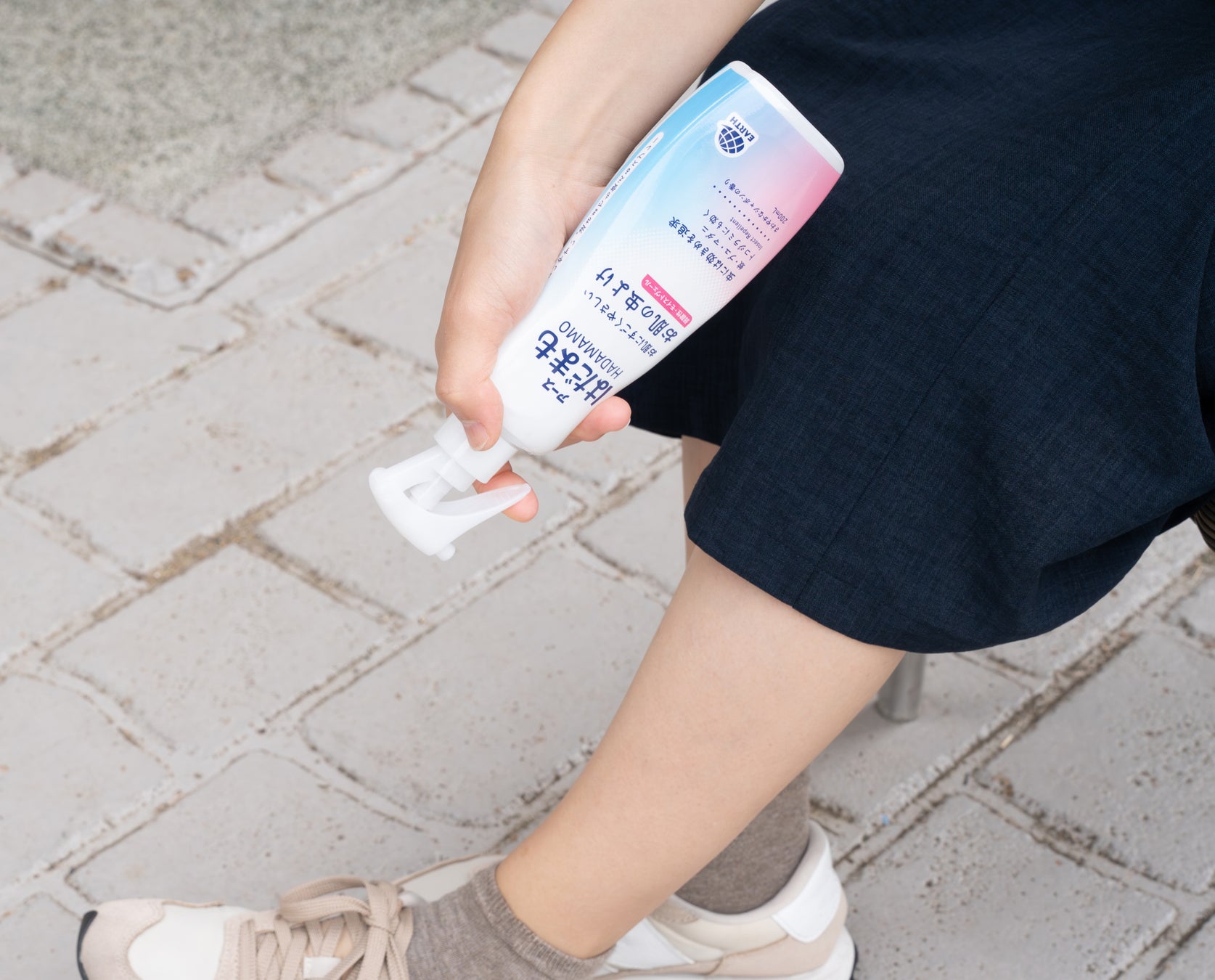 逆さまでも使えるスプレーのため、脚元などでも簡単にお使いいただけます。汗や水に強く流れにくい処方ですが、大量に汗をかいた後やタオルで拭いた後などは、こまめに塗りなおしてください。