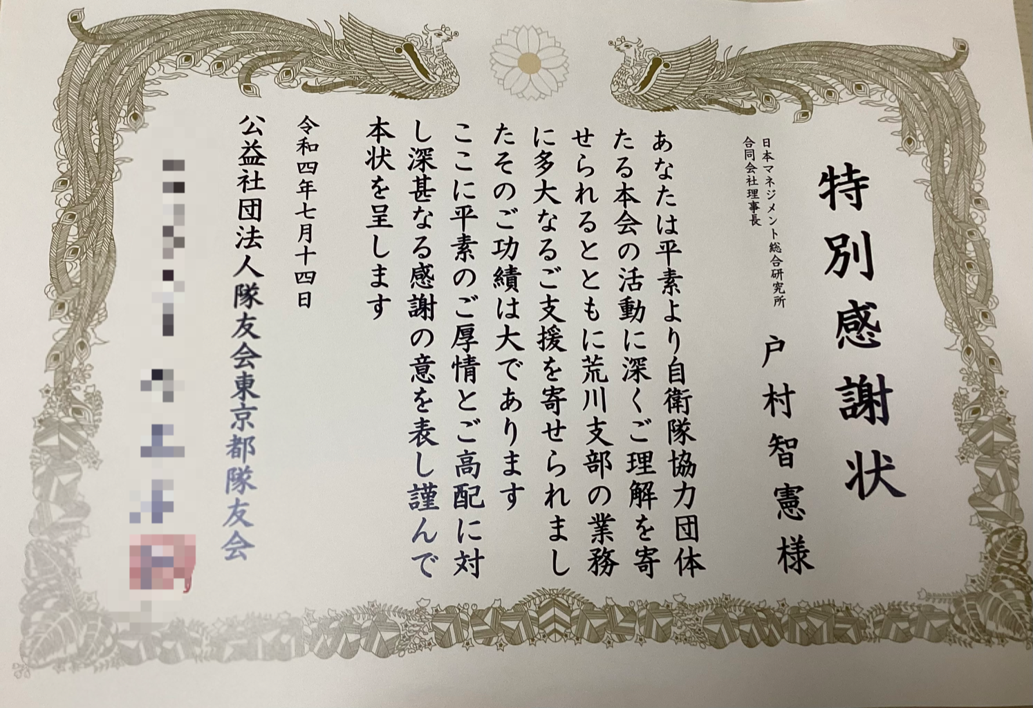 (公社)隊友会さま(自衛隊協力団体)「特別感謝状」を弊社理事長の戸村智憲が拝受致しました【日本マネジメント総合研究所合同会社】