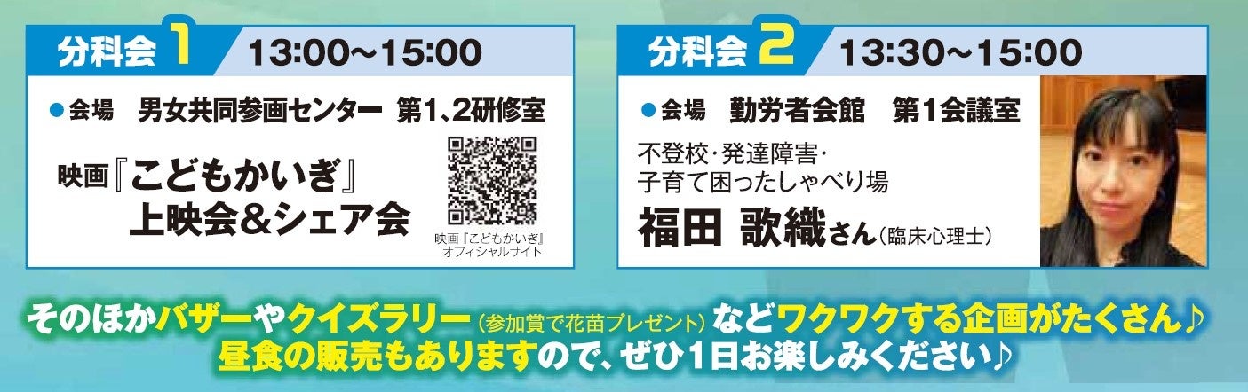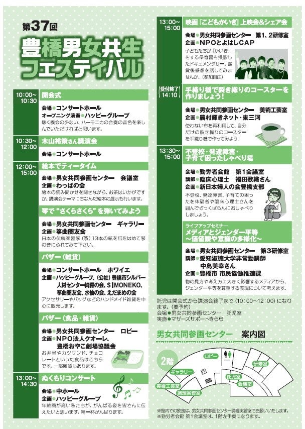 開催は今年で37回目。男女共同参画社会について考えるきっかけとなる講演会や、豊橋市内の団体・グループの活動発表、またバザーやクイズラリーなど楽しい企画もたくさんのイベントです。