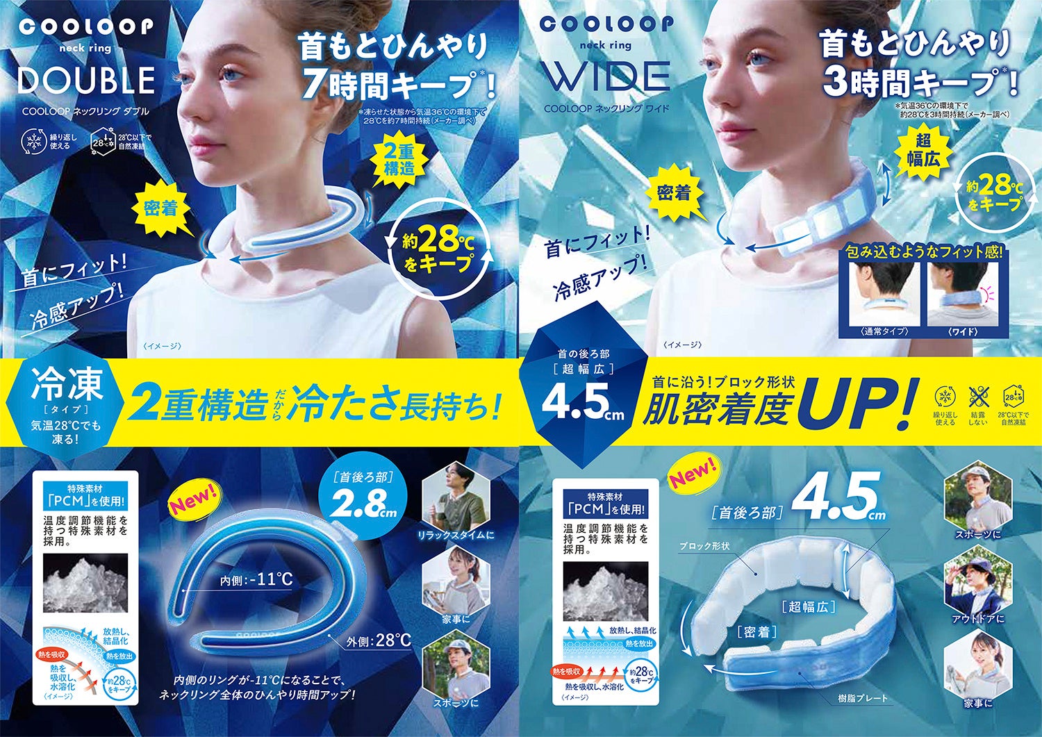 内側に温度設定-11℃のPCM、内側を覆う外側に従来通りの28℃のPCMを使用した2重構造のネックリング。冷凍庫で冷やせば、内側のリングが凍って、ひんやり持続時間がUP!冷凍後に気温36℃の環境下で28℃以下のひんやりを7時間キープします!(メーカー調べ)